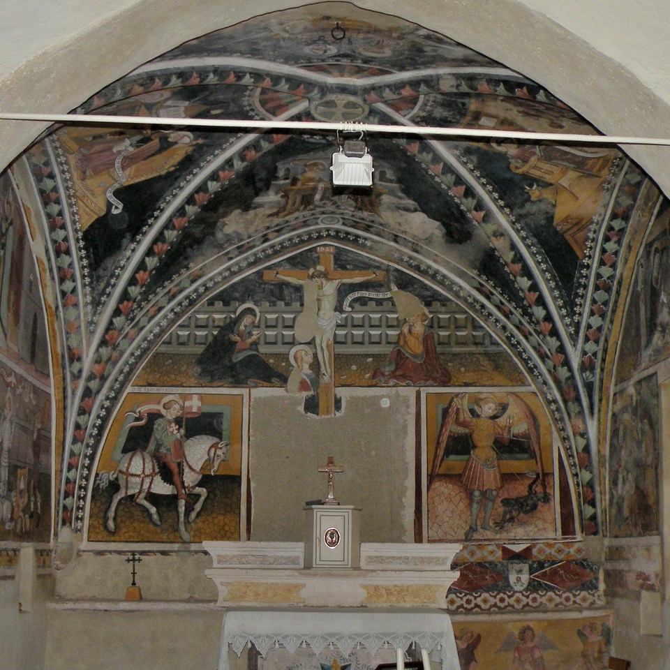 Gli affreschi si presentano come un complesso unitario, concentrati sulle tre pareti dell’area absidale. Sulla parete di fondo nella lunetta la Crocifissione caratterizzata da un’estrema essenzialità, a sinistra del Cristo in Croce la Madonna è accasciata e prostrata dal dolore, ai piedi della Croce Maria Maddalena con i capelli sciolti e sulla destra San Giovanni. Il cartiglio reca la scritta "Vere vere Filius Dei erat iste " (veramente costui era Figlio di Dio). Sotto, a sinistra, San Maurizio a cavallo di un destriero riccamente bardato con la coda annodata, che con la mano sorregge il vessillo di Cristo. A destra, San Michele Arcangelo rappresentato come un giovane cavaliere alato che tiene nella mano destra una lancia con cui infilza il demonio mentre, in qualità di giudice, con la mano sinistra sorregge una bilancia con la quale soppesa le anime.