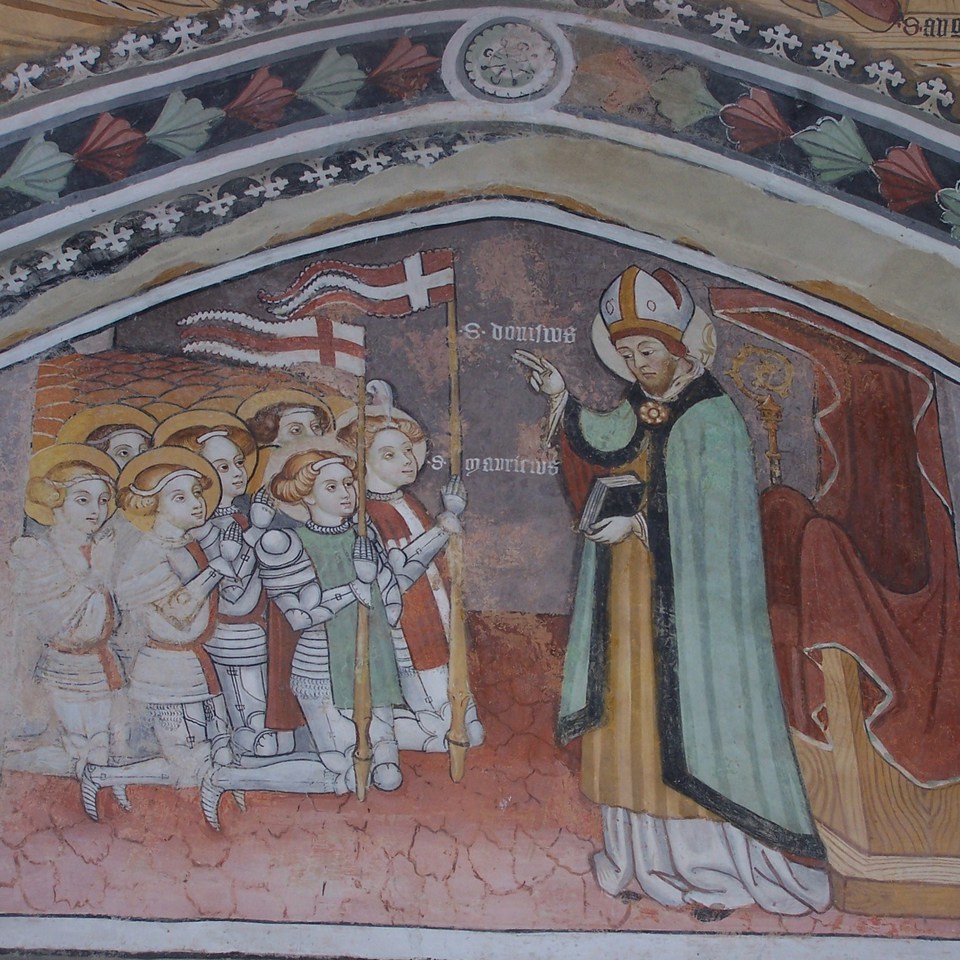 Nella prima scena, all’interno della lunetta, Maurizio e i soldati della Legione Tebea recano i vessilli della cristianità e sono in ginocchio per ricevere la benedizione da San Dionigi.