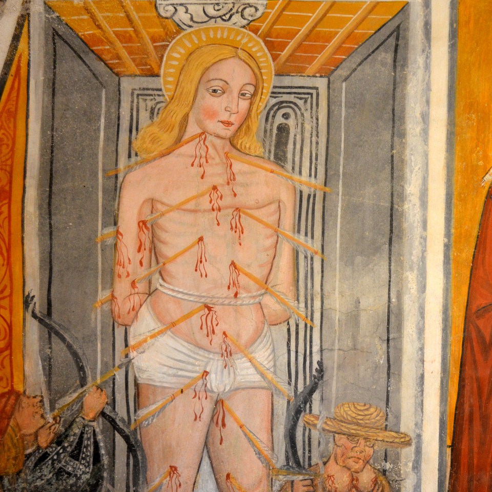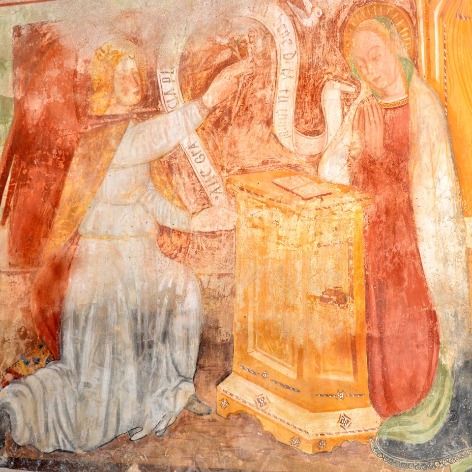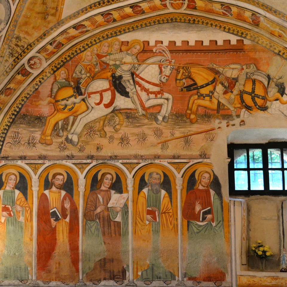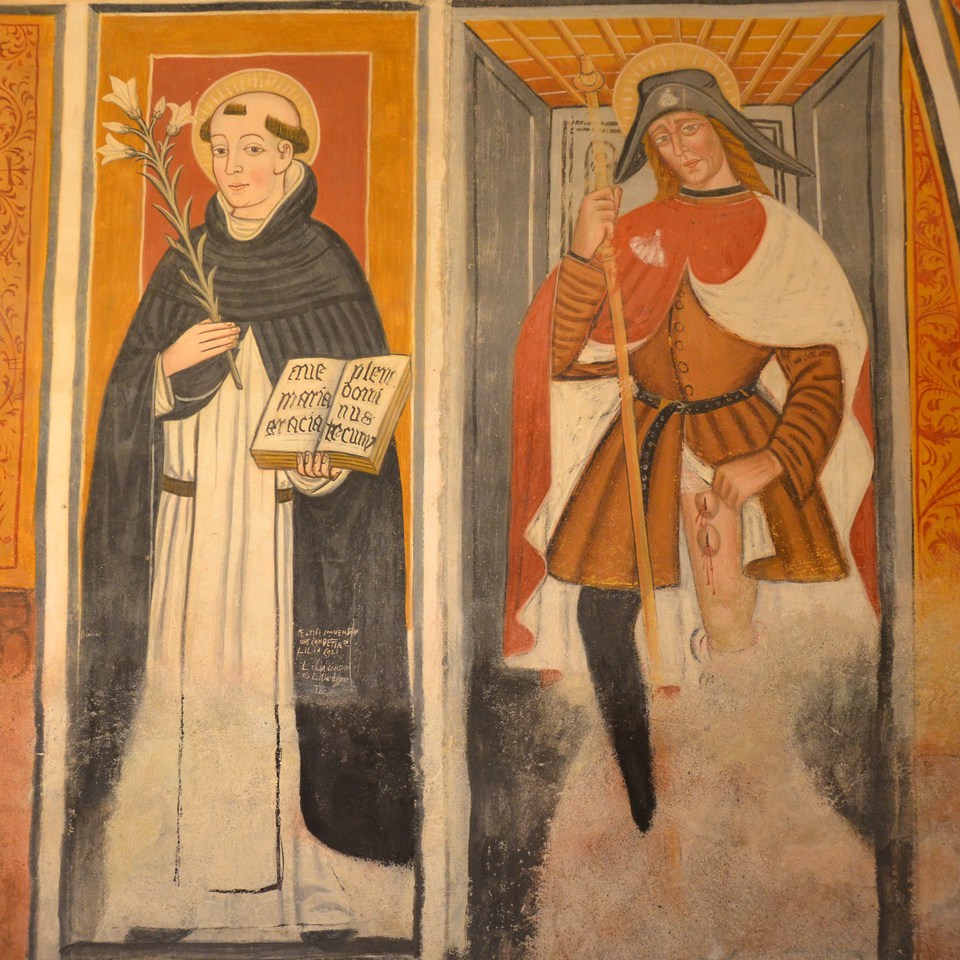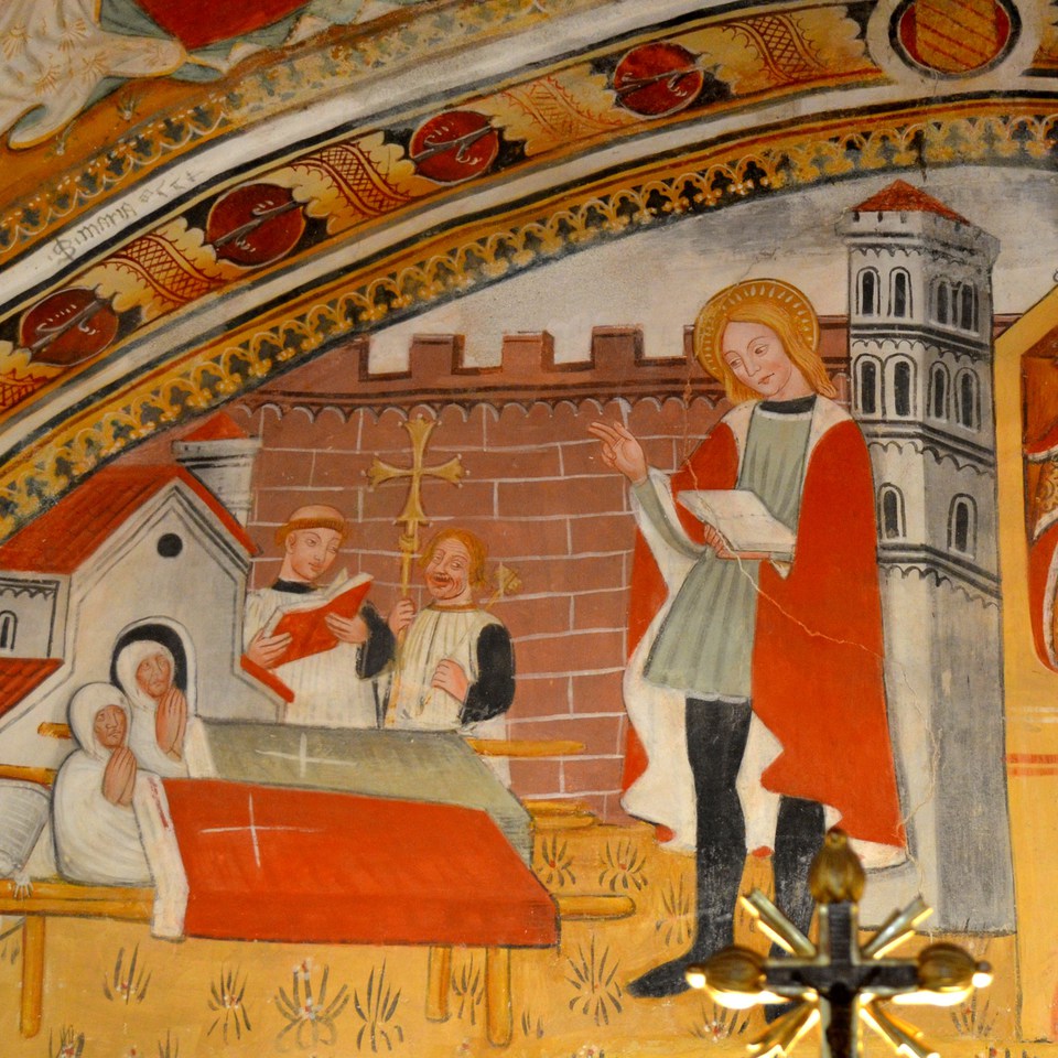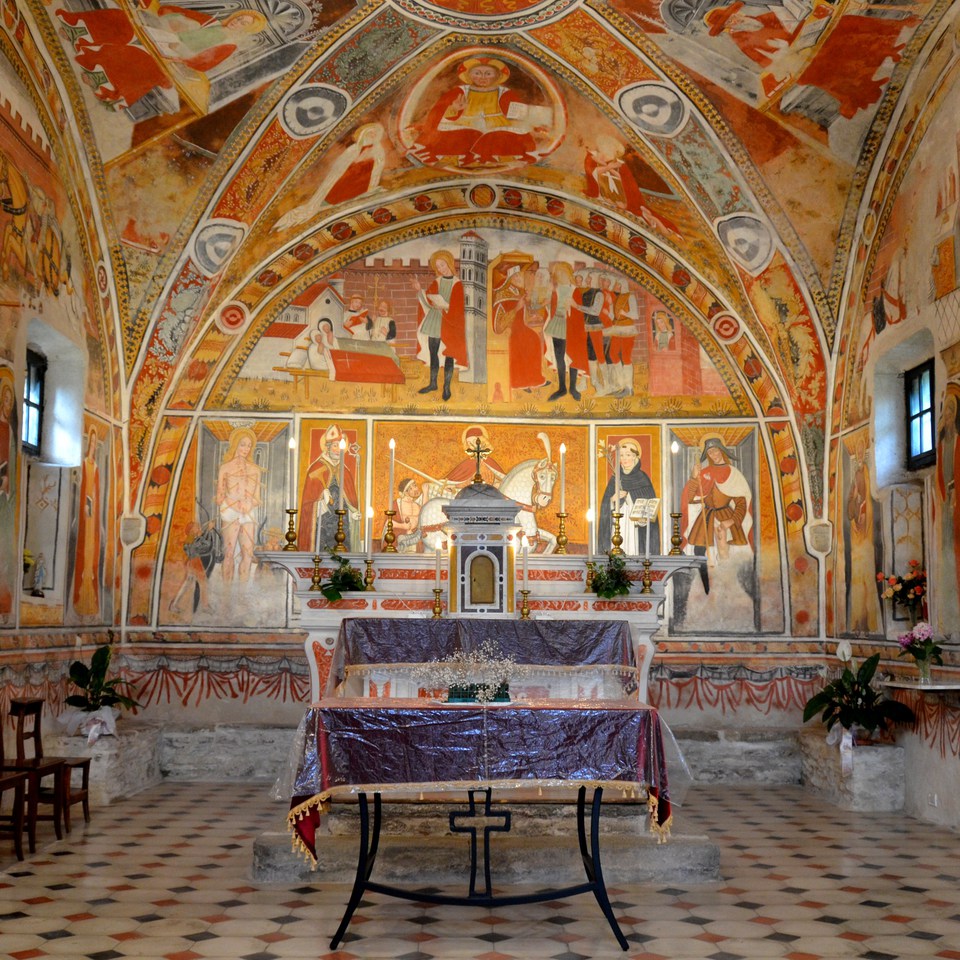 Il ciclo di affreschi all’interno della chiesa, rappresenta alcuni tratti salienti e leggendari della sua vita.
