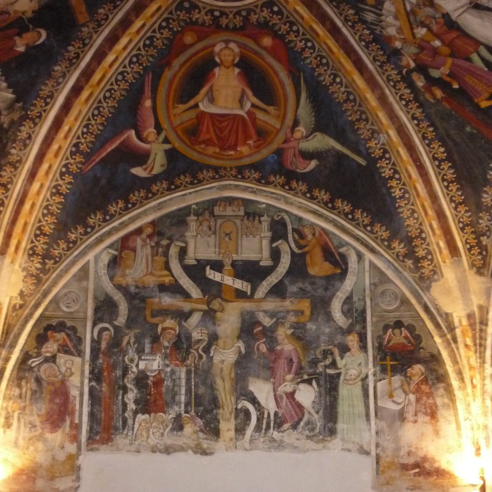 Tra i costoloni decorati e un rosone a spicchi, la volta a crociera ogivale propone nelle quattro vele il Cristo Pantocratore in mandorla, circondato da angeli nell’atto di mostrare le piaghe; la Deposizione con la consegna del corpo di Cristo alla Madre, alle Pie Donne e a San Giovanni nel contesto di un paesaggio montagnoso popolato da una ricca fauna; la Salita al Calvario con due personaggi reggenti trombe ornate da drappi effigiati con la sagoma di un drago alato; e la Flagellazione con Cristo alla colonna sotto una elegante edicola merlata.