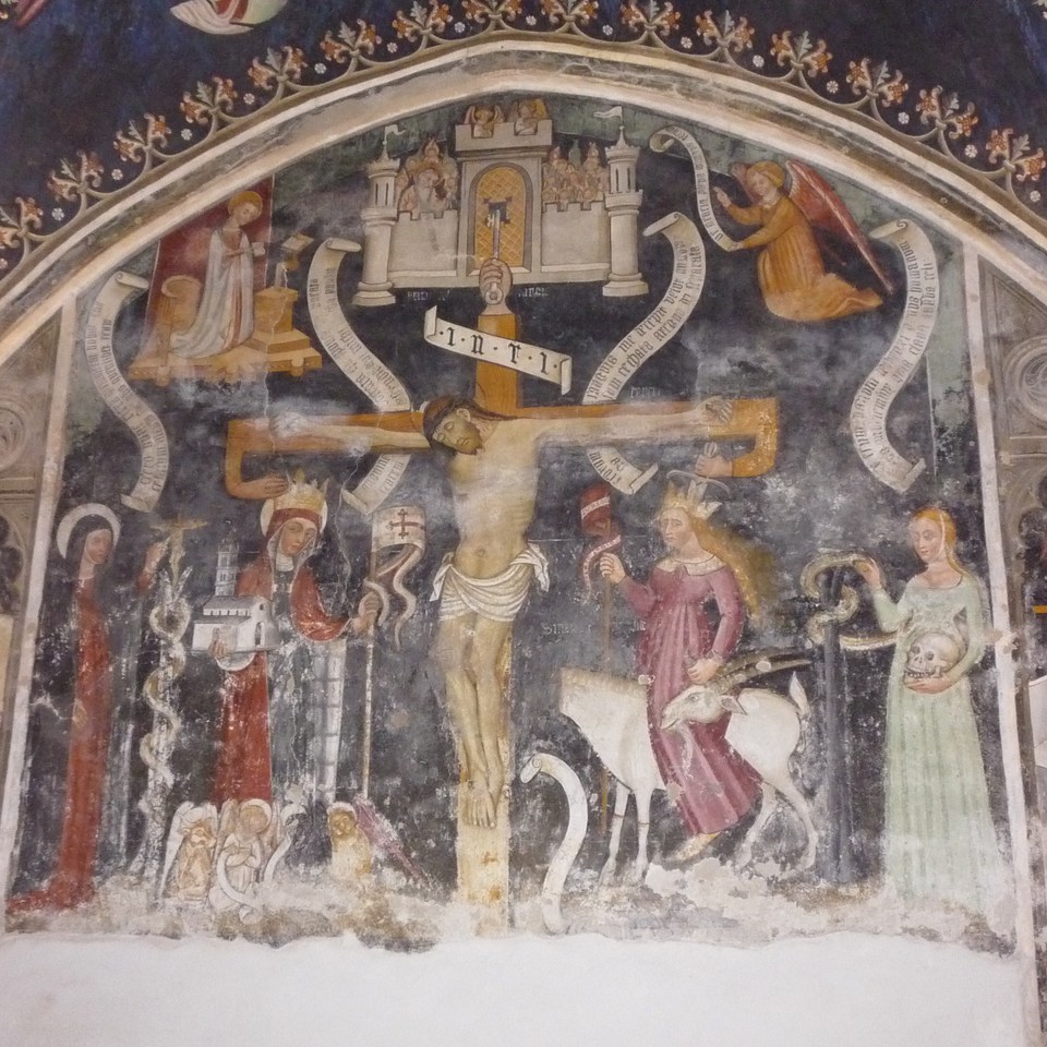 La parete dietro l’altare, ospita la scena della Crocifissione con il raro motivo iconografico della Croce vivente o Croce brachiale, i cui bracci si allungano in appendici in forma di mani, e rappresenta l’allegoria del Trionfo della Chiesa sulla Sinagoga.