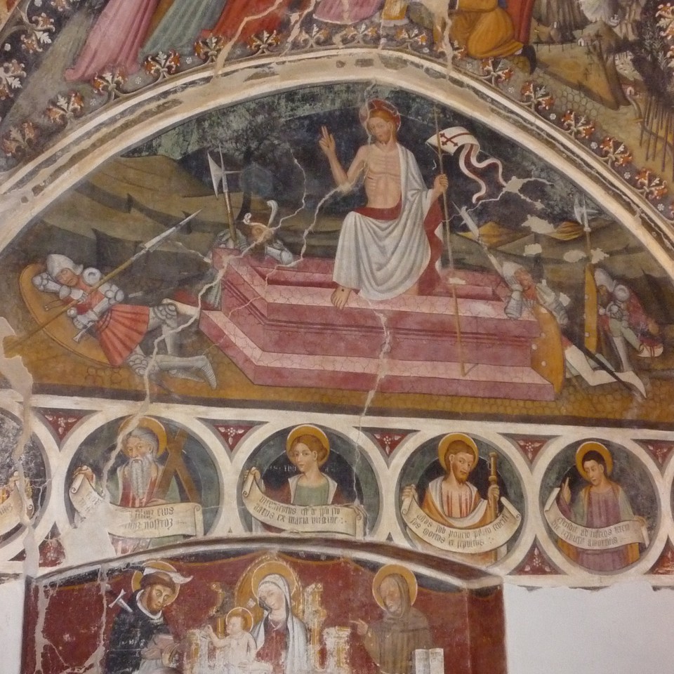 La lunetta ospita la rappresentazione della Resurrezione di Cristo che, in tunica bianca, e poggiante il piede destro sull’orlo del sepolcro scoperchiato, esce dalla tomba e impartisce la benedizione reggendo un bianco vessillo rosso-crociato, mentre i soldati sono vinti dal sonno.