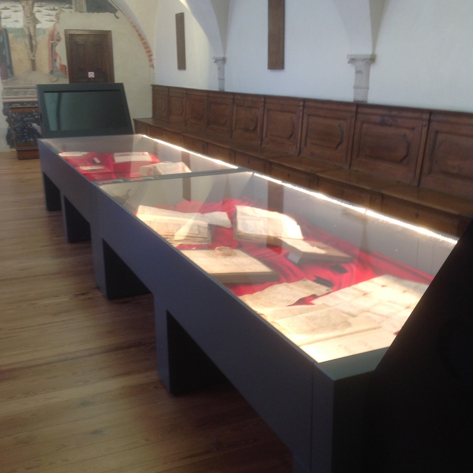 Infine nell’antica Sala Capitolare dove, sulla parete sud, è affrescata una splendida crocifissione di G.A. Merli (1478), sono conservati in apposite teche la documentazione della cultura manoscritta [Sala 12] che si apre con una carta di supplica del 729, la più antica testimonianza scritta su pergamena della chiesa novarese. Nello scriptorium vennero confezionati anche i libri per il servizio liturgico, bibbie, lezionari, sacramentari, messali, omeliari, processionali, rituali, spesso con le iniziali miniate e con preziose legature metalliche.