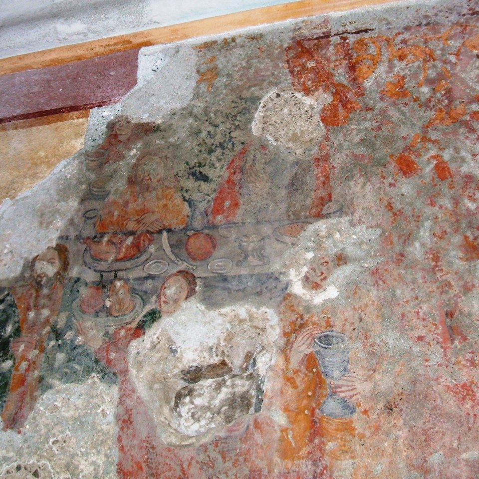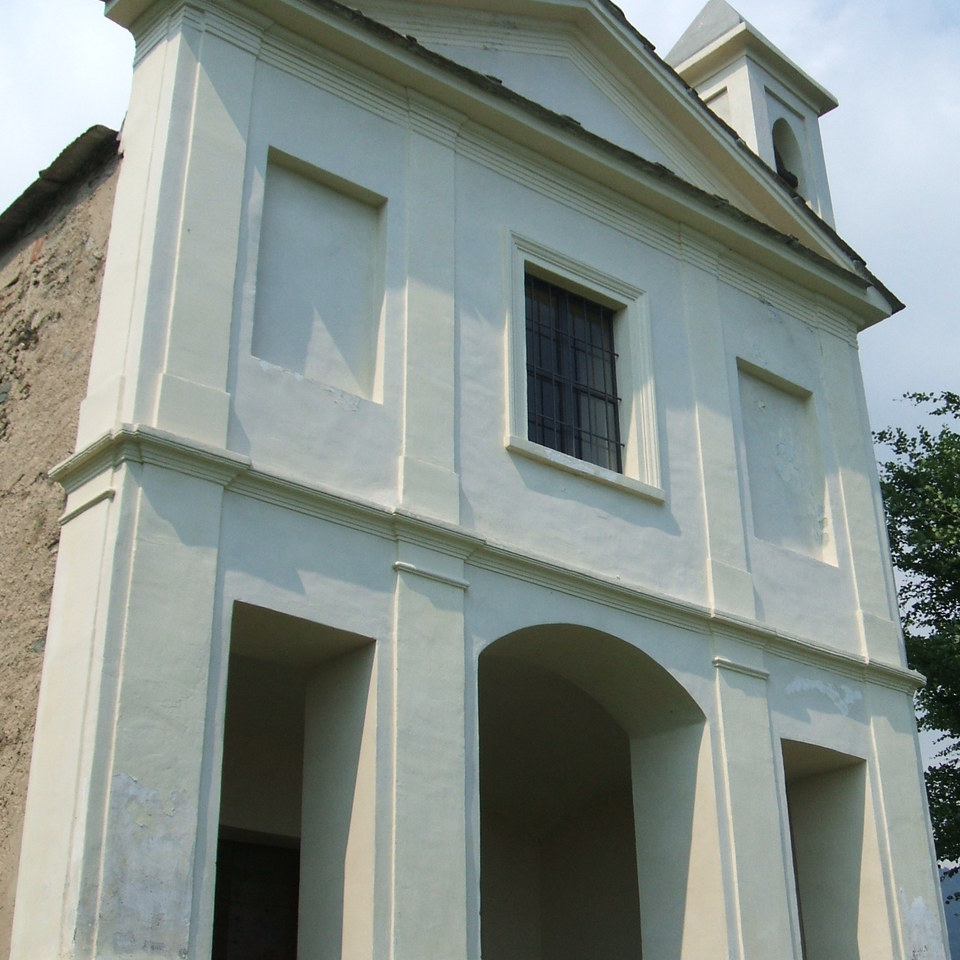 La cappella di San Grato si trova nella borgata Rocca, nel territorio dell’ex Comune di Mocchie, e sorge in una posizione rialzata rispetto all’abitato. L’edificio, originariamente intitolato a San Benedetto, è a pianta rettangolare orientata da sud a nord. Una cornice marcapiano divide la facciata in una parte più alta, coronata da un timpano al di sotto del quale si apre una finestra rettangolare, e una più bassa porticata nella quale si apre il portale. L’aula di preghiera si articola in una prima campata con volta a crociera e in una seconda voltata a botte. L’area presbiterale conserva un altare in muratura addossato alla parete di fondo e decorato a finto marmo. Tra la mensa liturgica e l’arcata che, a est, immette verso la sacrestia, è possibile vedere alcuni frammenti di un affresco un tempo più ampio. Si distingue la porzione inferiore di una figura che indossa un saio marrone stretto in vita da un cordone da cui pende una corona del Rosario con croce terminale. Al di sotto della figura corre una fascia viola decorata da un intreccio e accompagnata dall’iscrizione “P(RESBITE)R I(OANN)ES CUFFIA / CAPELLANUS A CU[…] HANC EFFIGIEM / RO[...] PIN[…] CURAVIT IN SUI / […] AGUSTI ANT[…]”. Lungo la parete occidentale emerge un affresco che rappresenta una scena conviviale, forse Le Nozze di Cana, contornata da un fregio a volute vegetali con fiori variopinti. La scena rappresenta una lunga tavola imbandita con piatti, brocche e pietanze, circondata da commensali. In primo piano si dispongono le figure stanti dei commensali e di due servi che portano un piatto con frutta e una coppa. Nell’angolo superiore il pittore ha dipinto una tenda che sembra discostarsi e rivelare l’episodio a chi guarda. Al di sotto dell’affresco è stato tracciato sul muro il disegno di un altare: ciò fa supporre che la scena fosse stata concepita come pala d’altare. Accanto alla scena appena descritta si nota una frammentaria scena di martirio. Il ciclo affrescato è assegnato ad un artista locale dalla ricca tavolozza cromatica e dall’immediatezza dei particolari, attivo probabilmente alla fine del XVII secolo.