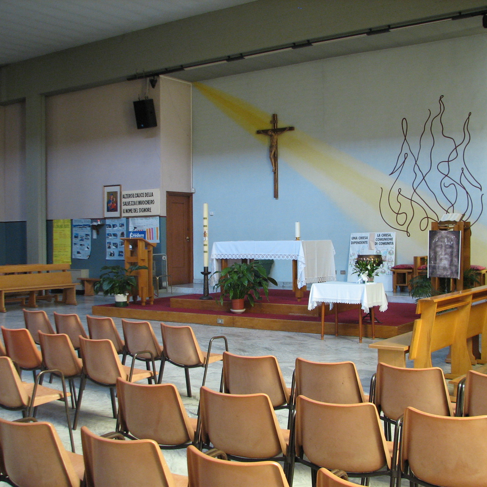 L’accesso laterale introduce all’aula liturgica a pianta centrale. I poli liturgici della celebrazione, in legno, sono posti su una pedana mobile. Questa conformazione della zona presbiteriale e la presenza di filari di sedie, in plastica, al posto di banchi, testimoniano ancora la vecchia funzione di salone polifunzionale per cui era nata.
