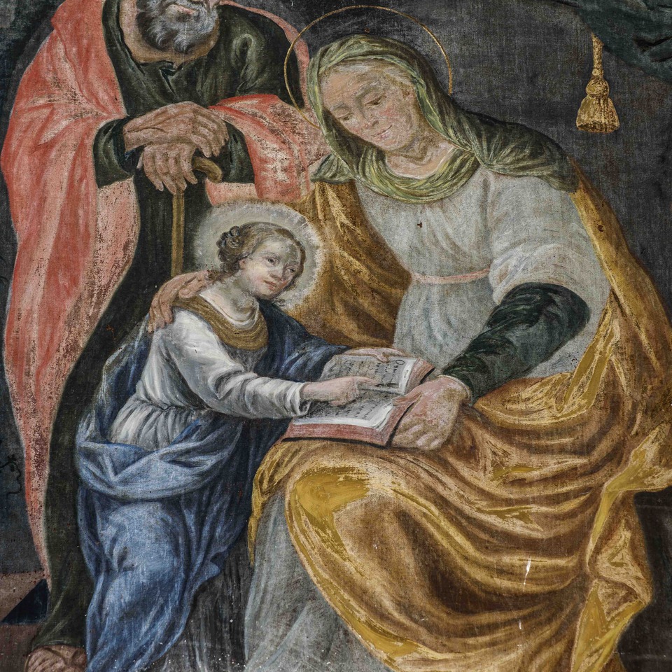 altare, con la scena dell’Educazione della Vergine che coglie il momento in cui legge un libro e viene a conoscenza del suo prodigioso destino. A Sant’Anna si attribuiscono qualità taumaturgiche, oltre ad essere la protettrice dei moribondi e delle partorienti.