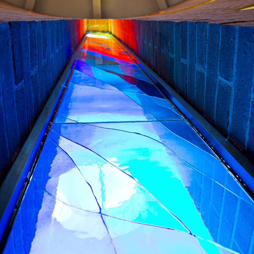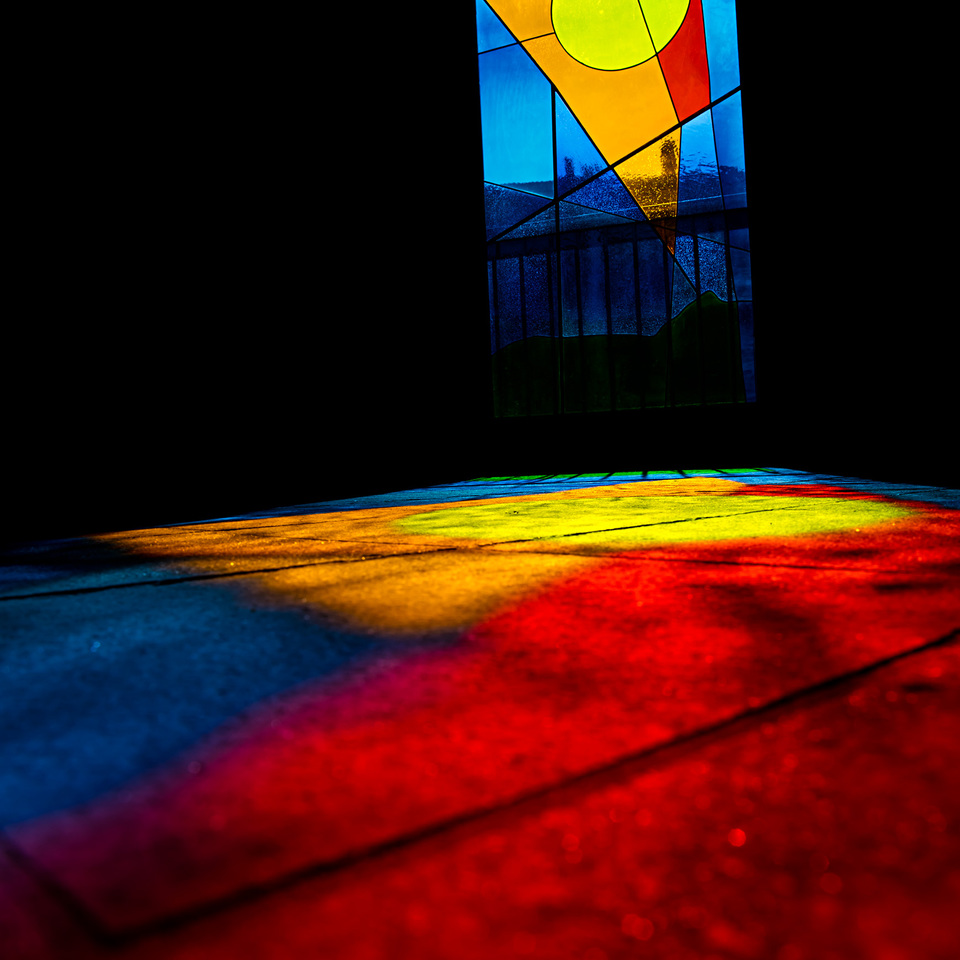 La croce, collocata dietro l'altare maggiore è realizzata con vetri colorati e ha in alto i colori del fuoco, del sole e della luce e in basso i colori dell'acqua. Sole e acqua sono infatti i due principi fondamentali della vita.