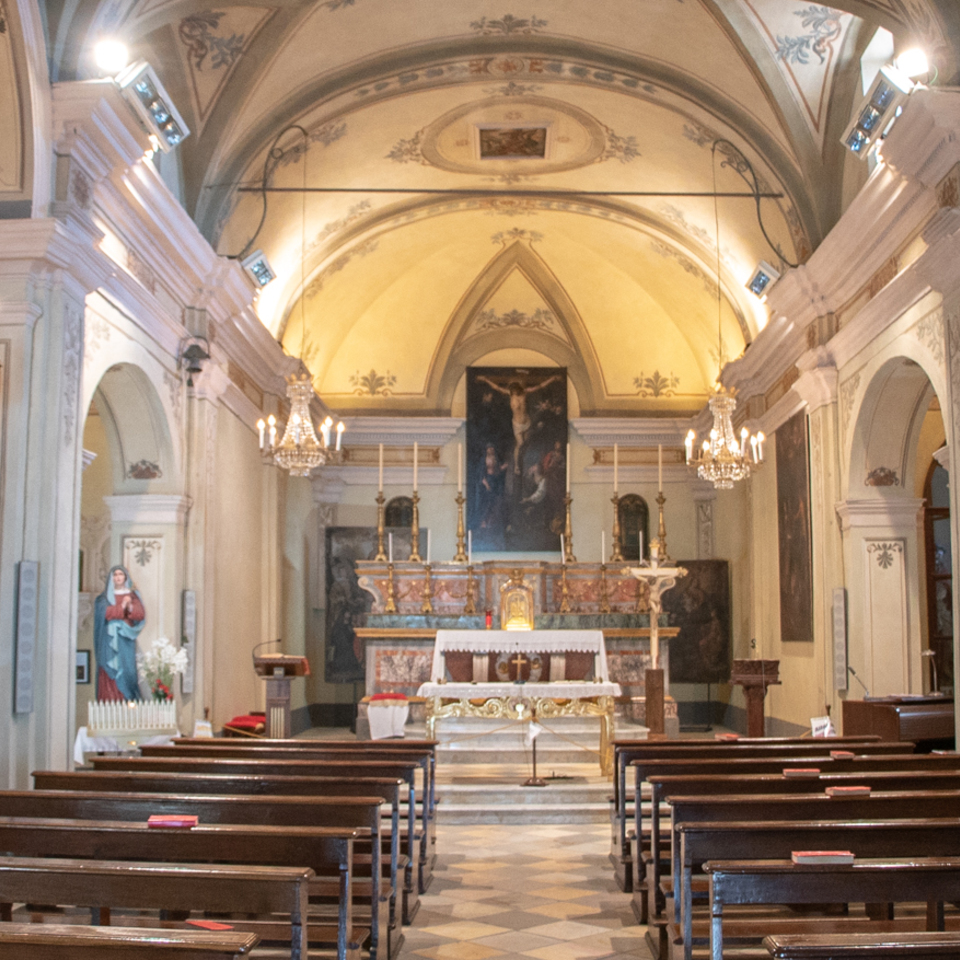 Varcata la soglia d’ingresso, si svela uno scrigno di modeste dimensioni che contiene opere d’arte di pregio, segno di una committenza di elevato rango sociale. L’aula ospita tre altari, il maggiore ornato dalla pala della Crocifissione del pittore fiammingo Jean Claret (1656) appesa in alto alla parete absidale, e due laterali.