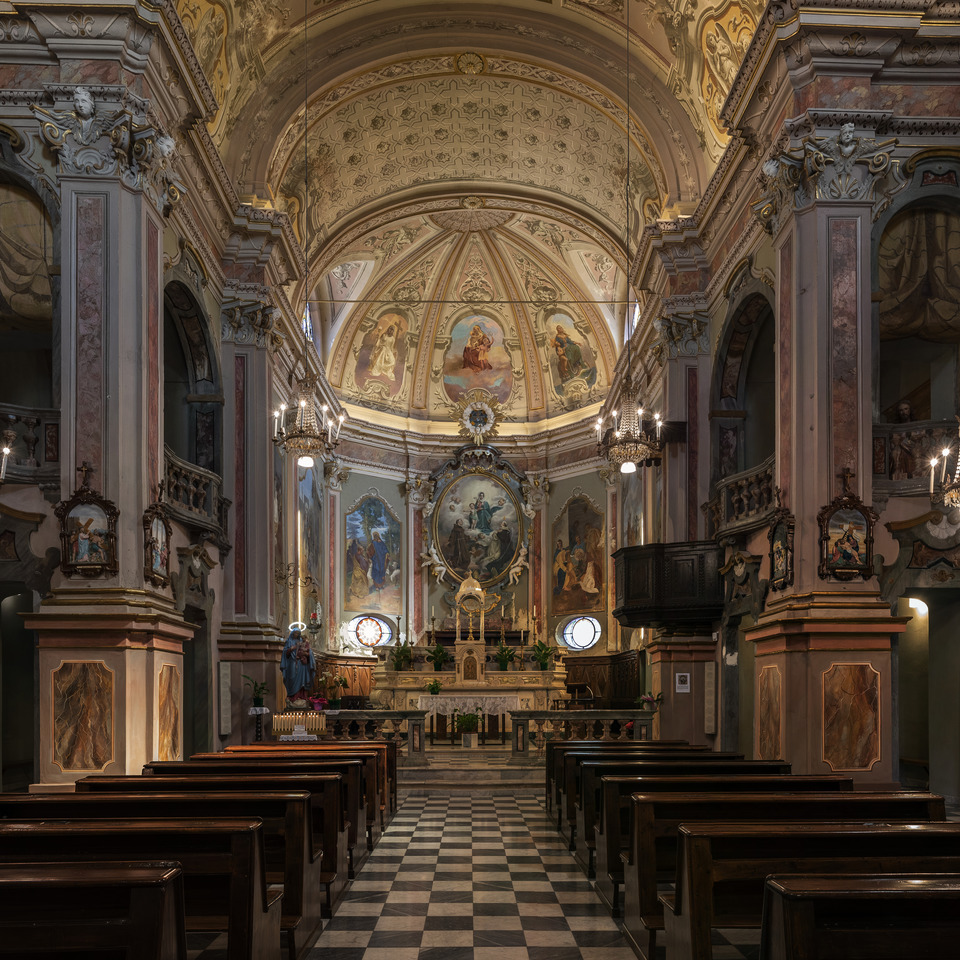 Nel 1727 la chiesa viene ricostruita in forme barocche col sussidio delle elemosine della comunità su disegno dell’architetto Giovanni Garelli con la direzione dei mastri Domenico Pianca e Isidoro Torriano. L’esito è un edificio a croce greca con aula unica e ampio coro adatto ad espletare le funzioni associative dei confratelli. L’interno presenta pregevoli altari tra cui spicca quello dedicato al Crocifisso, fornito di un’imponente decorazione in stucco marmoreggiato a fare da corona al Cristo quattrocentesco.