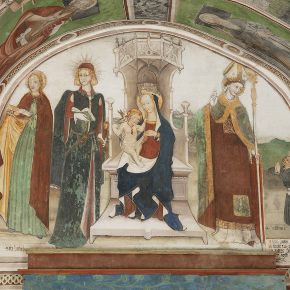 Sulla parete principale, quella frontale, sono raffigurati al centro la Madonna con Bambino, seduti su un imponente trono e connotati da particolari ricercati come l’uccellino posato sulla spalla di Gesù e un corallo che porta al collo. A sinistra si trovano il beato Amedeo IX di Savoia e santa Lucia. A destra san Giulio, affiancato dai committenti oranti in ginocchio.