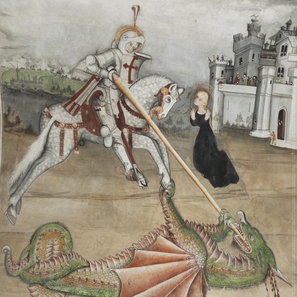 Si deve principalmente alla Legenda Aurea di Jacopo da Varagine il racconto delle gesta di san Giorgio. Nato, secondo la tradizione, in Cappadocia intorno al 275 d.C e morto a Nicomedia nel 303 d.C., è uno dei primi martiri cristiani. Trasferitosi in Palestina si arruola nell’esercito di Diocleziano comportandosi come soldato valoroso, fino a divenire uno dei membri del suo corpo di guardia. Ma difronte al rifiuto di Giorgio di sacrificare agli dei, è lo stesso imperatore a volerne la morte.
