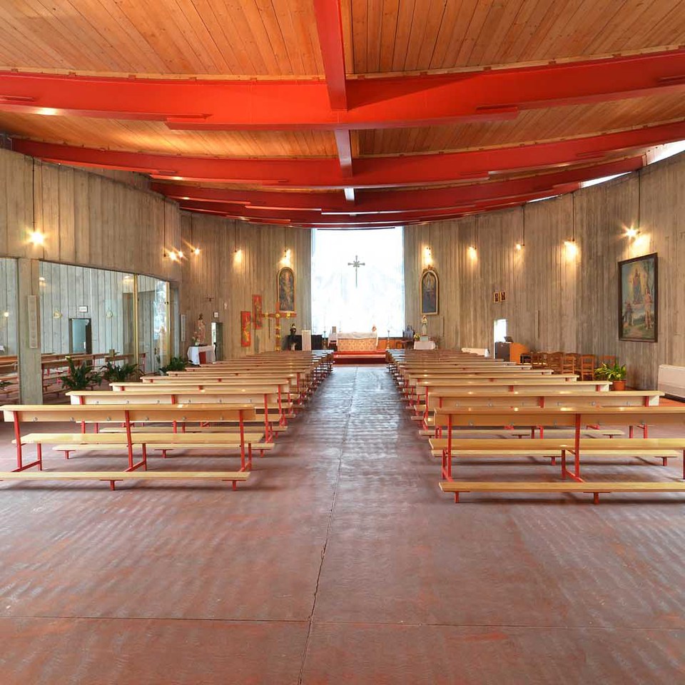 I caratteri esterni ritornano all'interno della chiesa, infatti i materiali utilizzati sono gli stessi; l’interno si presenta con un’unica navata, che costituisce il basamento dell’intera struttura, ma anche per connettere la cappella della Madonna del Rosario, elemento appartenete all’antica chiesa. Le pareti laterali in cemento armato ospitano delle tele di arte contemporanea e al centro della navata sono collocati i banchi realizzati con una struttura metallica rossa con seduta e schienale lignei. La luce penetra nella chiesa attraverso grandi superfici vetrate: dietro l'altare maggiore e a fianco dell'antico altare nella navata minore.