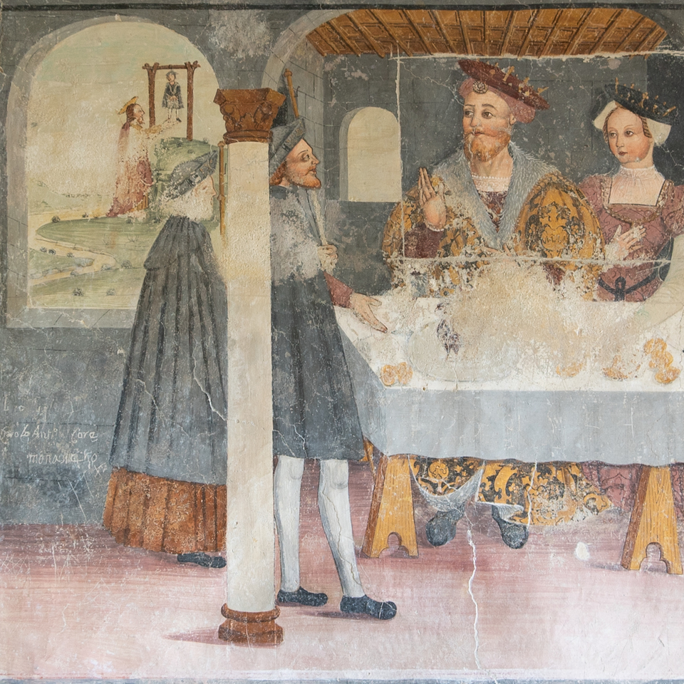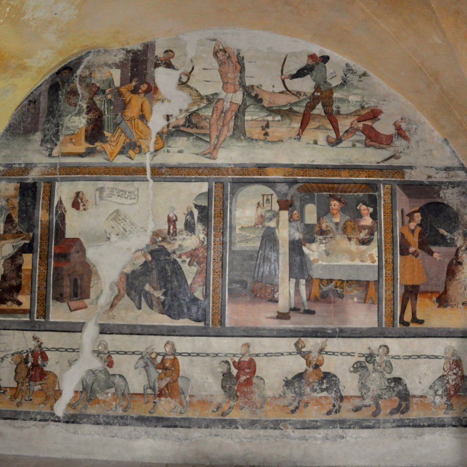 L’esterno semplice con struttura porticata antistante nasconde uno scrigno di affreschi, opera di Antonino Occello da Ceva. Pittore di area monregalese nato ad inizio Cinquecento, proviene da una nobile casata che annovera altri frescanti.