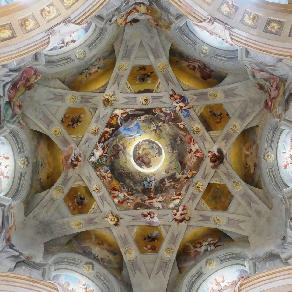 La volta è articolata su tre livelli - due triangoli che intersecati che formano un esagono e due semicalotte sferiche - e conclusa da un cupolino.
