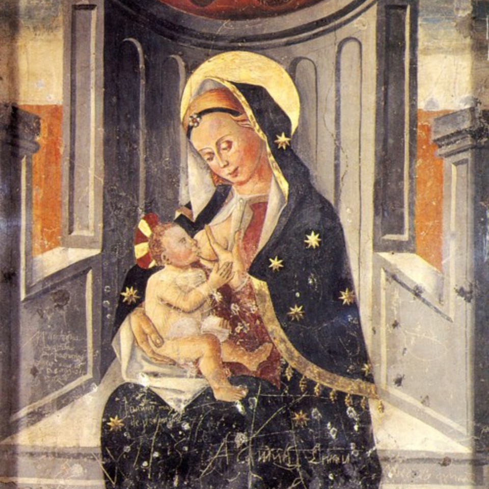 Nella sacrestia della cappella è conservato un affresco datato ai primi anni del XVI secolo e attribuito al pittore albese Jacopino Longo. L’affresco, probabilmente staccato da un pilone votivo o forse parte dell’antica cappella dedicata alla Madonna della Neve, raffigura Maria Vergine, assisa su un trono marmoreo, che regge in grembo Gesù. La Vergine ha un manto azzurro cosparso di stelle in oro zecchino; il Bambino tiene con una mano quella della Madre, con l’altra regge una sfera, simbolo imperiale (l’imperator Mundi). La Madre allatta Gesù Bambino, in un tenero gesto familiare. L’affresco è deturpato da scritte devozionali e date antiche, ascrivibili tutte ai secoli XVI e XVII: si riconoscono i nomi di alcuni personaggi -forse pellegrini- provenienti da Podium Varinii (l’antica Poirino) e forse il nome di qualcuno del seguito del re Luigi XII di Francia, ospite nel castello di Carignano nel 1502 e nel 1507 presso la corte di Bianca Paleologo, vedova del duca Carlo I di Savoia.