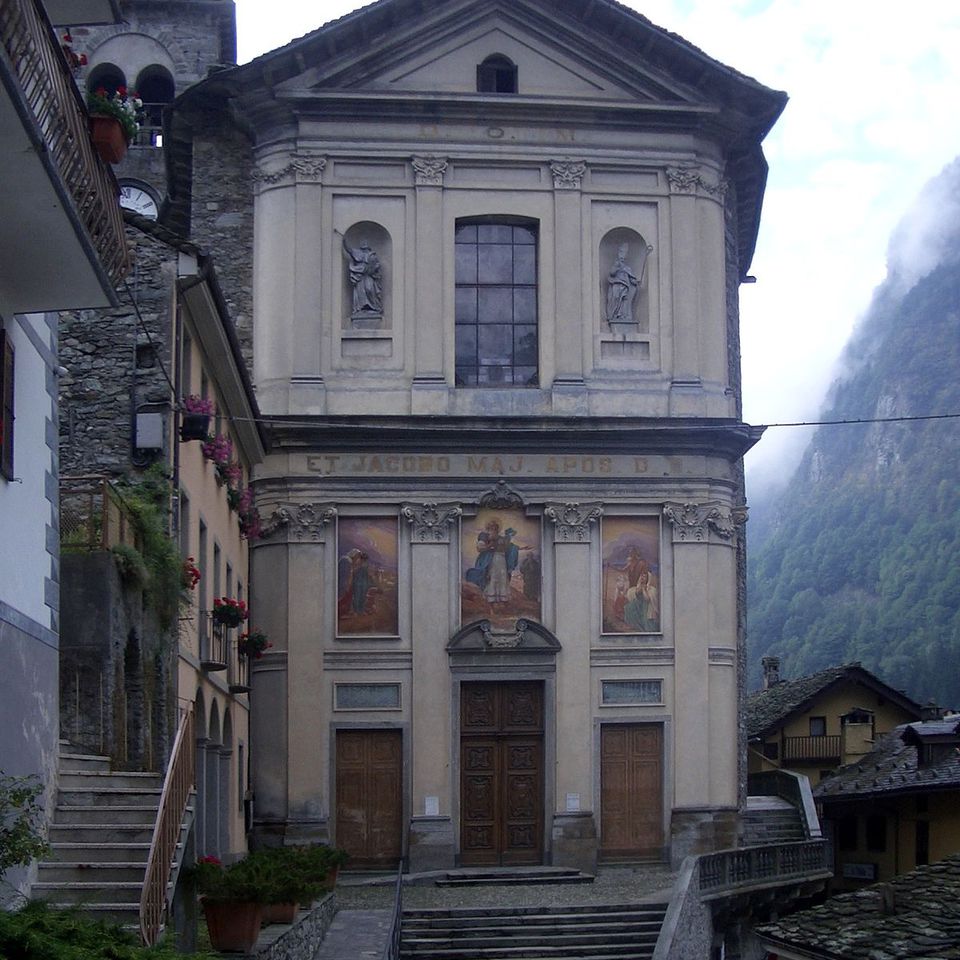 Tra le opere pittoriche che decorano l’interno spiccano gli affreschi settecenteschi di Carlo Borsetti nella volta del coro e del torinese Giovanni Milocco nella navata; nel presbiterio, invece, si trovano gli episodi della vita di San Giacomo realizzati nel 1832 dai fratelli Avondo. Si conserva l’antico catino della vasca battesimale, risalente al 1415, completa della copertura lignea del ‘600. Sull’altare della Madonna del Rosario si possono osservare i quindici Misteri affrescati dal maestro campertognese Pier Celestino Gilardi nel 1879; gli fanno eco, nella facciata esterna, gli affreschi di San Giacomo eseguiti da Bialetti ma realizzati grazie ai cartoni preparatori del maestro campertognese Camillo Verno.
