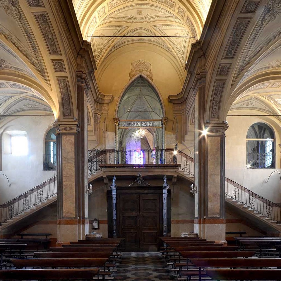 Le prime tre campate sono coeve, mentre la quarta campata, verso la casa parrocchiale, è stata aggiunta successivamente. L’aggiunta dell’ultima campata potrebbe essere stata motivata allorché nel XV secolo si decise di ospitare e venerare le reliquie di San Sereno edificando una cappella al piano superiore. Il tiburio ottagonale che si sopraeleva potrebbe essere stato aggiunto in questa fase.
