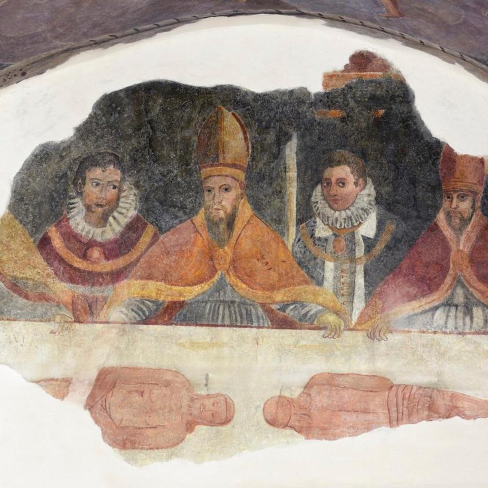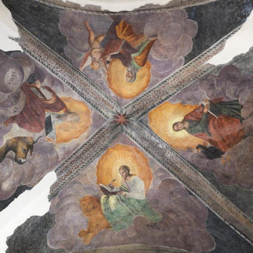 Lo svolgimento narrativo ha inizio sulla volta dove sono affrescati gli Evangelisti, intenti a comporre le Sacre Scritture da cui si apprende l’annuncio della salvezza. Sono loro che introducono il fedele nel mistero della Pasqua. Al centro dei costoloni della volta è poi collocata una stella ad otto punte: è un centro sacro atto a richiamare l’ottavo giorno.