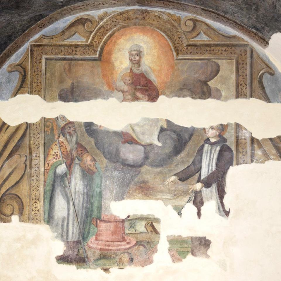 La parete principale invece è decorata con un affresco che vuole imitare, illusionisticamente, una grande pala d’altare. Raffigura la Vergine col Bambino e i santi Grato d’Aosta e Bernardo da Mentone. Ad oggi non vi sono notizie rispetto all’autore e alla committenza del ciclo, ma i dati di stile inducono verso l’epoca manierista.