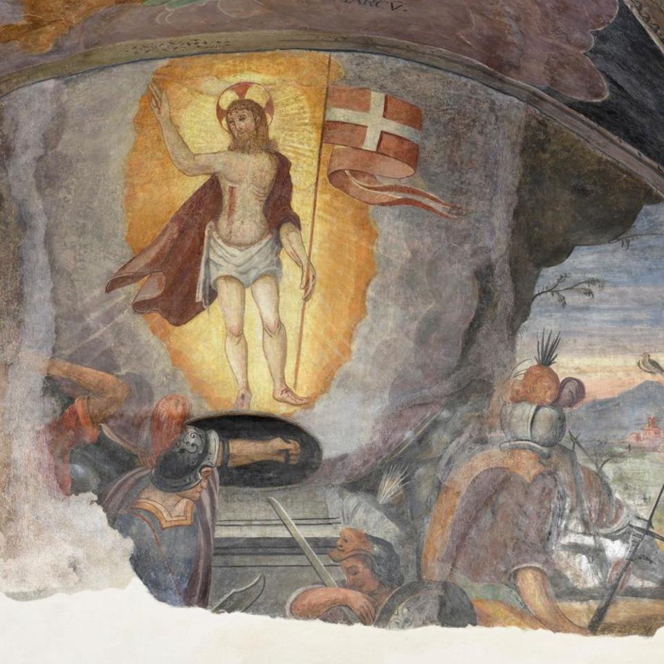 Sulla parete occidentale si trova una lunetta con la raffigurazione della Sindone, che tratta della passione e della morte di Cristo. Sulla quella orientale è invece dipinta la Resurrezione. Il Risorto troneggia al centro della scena con un’esplosione luminosa, la cui fonte è Cristo stesso.