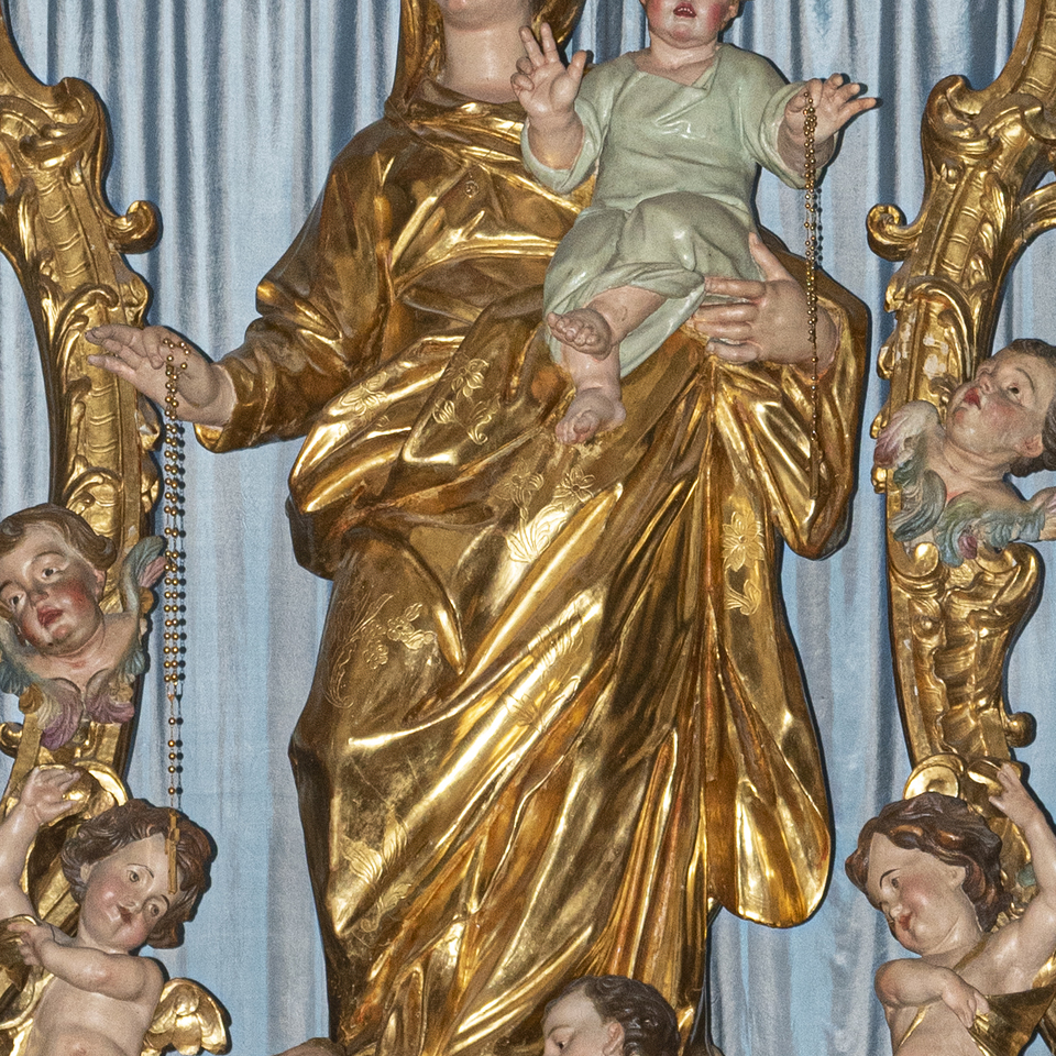 La devozione per la Madonna del Rosario nacque a Monchiero grazie agli eventi miracolosi verificatisi in seguito alla realizzazione della statua dedicata alla Vergine col Bambino di Stefano Maria Clemente nel 1751, statua che nel 1756 venne ornata con due corone d’argento donate dalla marchesa di Monforte. Per l’occasione la chiesa fu ornata con tappezzerie e ceri e si fece una grande festa con fuochi d’artificio. L’incoronazione ufficiale della statua e l’erezione dell’edificio a santuario si ebbero dopo un lungo percorso burocratico presso il Capitolo di San Pietro conclusosi, nel 1773, grazie anche all’interessamento del vescovo Giacinto Amedeo Vagnone e di Vittorio Amedeo III di Savoia. Il 15 di agosto di quell’anno ci fu la solenne cerimonia dell’Incoronazione.