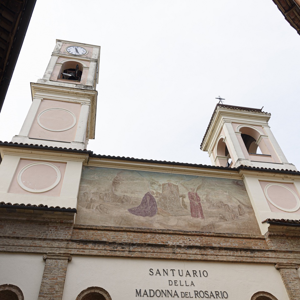 Il santuario sorge nel borgo vecchio, l’attuale Monchiero Alto, sull’altura ove era stata edificata la primitiva chiesa parrocchiale. Ci accoglie una sobria facciata caratterizzata dalla singolare presenza di due campanili e da un affresco del pittore Claudio Bonichi realizzato, nel 1973, sopra il portale d’ingresso. L’interno dell’edificio, riccamente decorato, ci racconta la lunga storia del santuario, per secoli oggetto di devozione. La costruzione ebbe inizio nel 1739 in sostituzione della primitiva sede parrocchiale ormai in rovina, mentre il culto mariano si sviluppò dal 1751, grazie alla venerazione per la statua lignea dedicata alla Madonna del Rosario, realizzata in quell’anno dallo scultore torinese Stefano Maria Clemente. Possiamo ancora ammirare la preziosa opera nella nicchia che sovrasta il presbiterio, dietro all’altare maggiore, fiancheggiata da due dipinti del pittore braidese Pietro Paolo Operti raffiguranti San Colombano e San Giovanni Battista, coevi alla scultura. L’edificio si presenta con un’unica navata e cinque altari: quello principale “alla romana” e quattro laterali. L’interno è interamente affrescato e i dipinti sulle volte raffiguranti episodi del Vecchio e del Nuovo Testamento risalgono alla campagna decorativa del 1825, mentre un consistente intervento di ristrutturazione si deve al noto architetto albese Giorgio Busca negli anni 1854 – 1876. Anche il secondo campanile venne realizzato in quell’occasione. Tornando alle opere d’arte in essa conservate, dobbiamo ancora ricordare altre statue lignee scolpite tra 1751 e 1752 dai fratelli Stefano Maria e Giuseppe Maria Clemente, tra cui il Crocifisso tra angeli e santi e il dipinto settecentesco della Sacra Famiglia di ambito milanese. Il Battistero è ornato da un bassorilievo rappresentante San Giovanni Battista che battezza Gesù, opera settecentesca del braidese Giuseppe Antonio Barelli. Tra le decorazioni più recenti ricordiamo le opere del pittore torinese Rodolfo Morgari e dell’indoratore Isidoro Giussani della seconda metà dell’800.