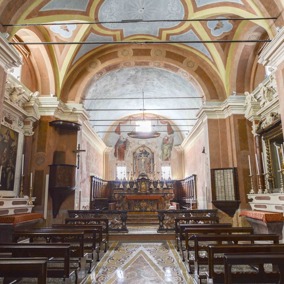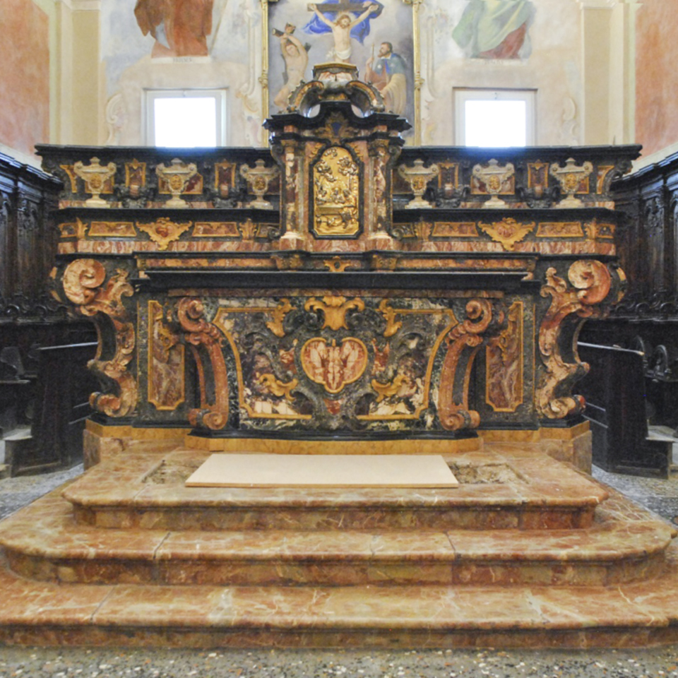 Il coro riccamente intagliato, con 18 stalli, è del 1785. Si vede ancora la tabella di confraternita, qui erano riportati i nomi dei confratelli e le rispettive cariche.