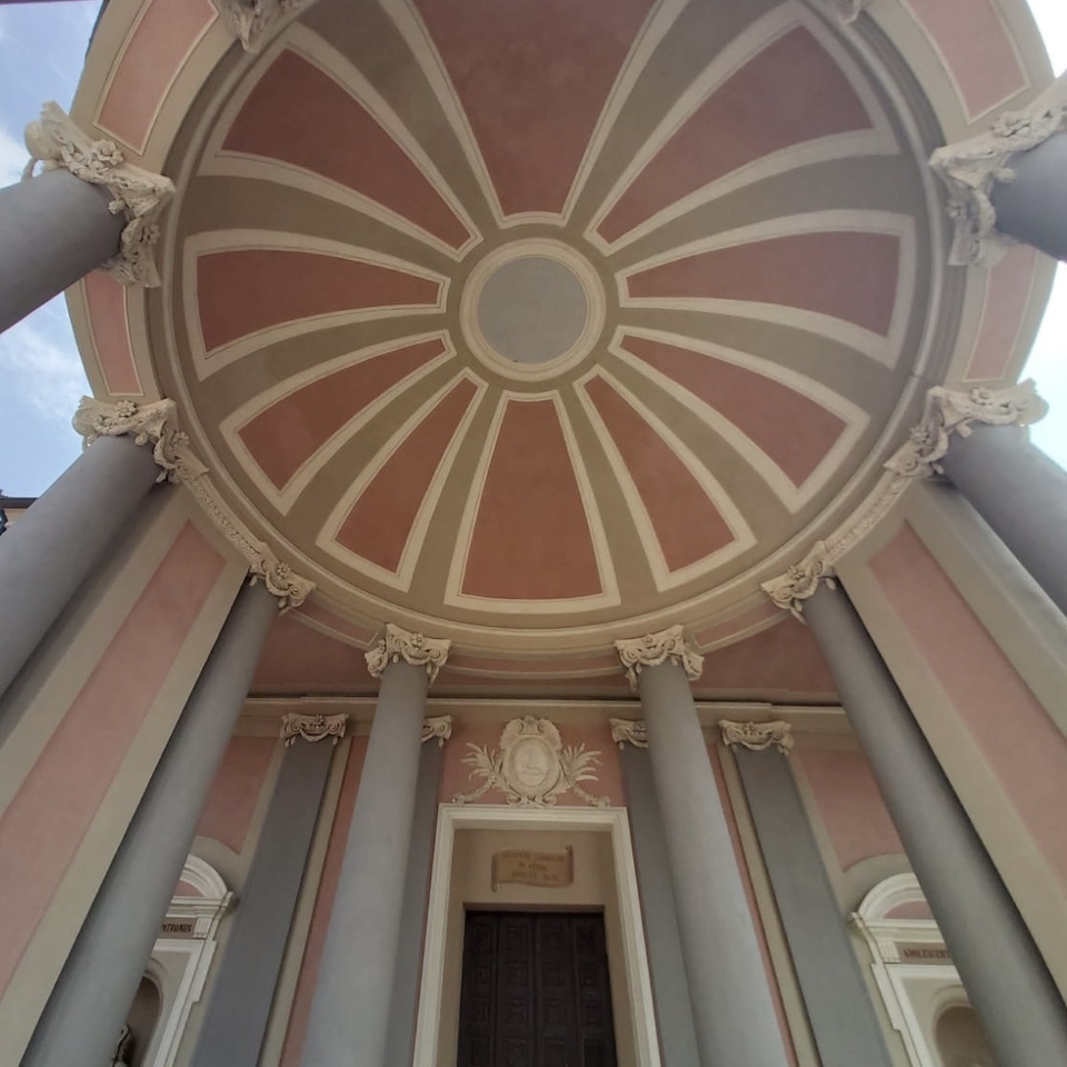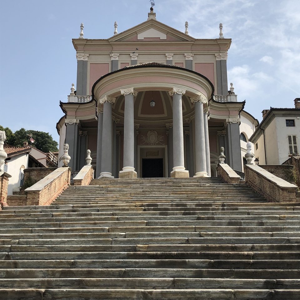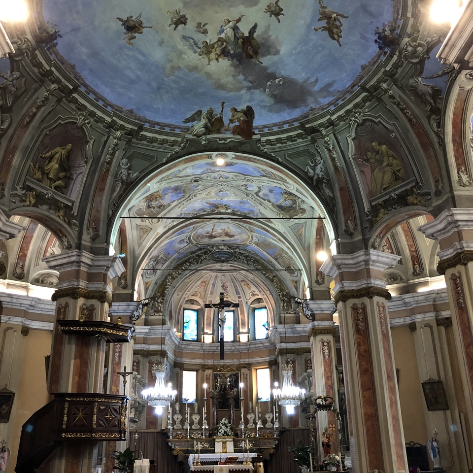 Sullo stesso sito nel 1730, dopo aver demolito un intero isolato del ricetto viene edificata l’attuale chiesa con forma più ampia e con la facciata rivolta verso la piazza. Nel 1776 furono fabbricati, su disegno del conte Beinasco, il pronao circolare e la scalinata sotto la quale si formarono un tempietto-cripta a pianta circolare e il cimitero. La pianta rettangolare fu ampliata in forma circolare con cupola nel 1822-1824 dall’arch, Pietro Del Mastro e dedicata all’ Assunta. L’interno barocco ha un deambulatorio nella parte centrale circolare e la volta con cupola centrale emisferica è affrescata con l’Assunzione della Vergine tra angeli musicanti. I dipinti murali sono opera di Pier Paolo Pasqualini e ai lati del presbiterio sono raffigurati San Martino e la Decollazione del Battista. E' conservata una tela di Orsola Caccia raffigurante San Giovanni Battista, una delle poche opere firmate e datate (1644). L'iscrizione cita il pievano De Alessi e proviene dalla chiesa non più esistente dedicata proprio a San Giovanni Battista.