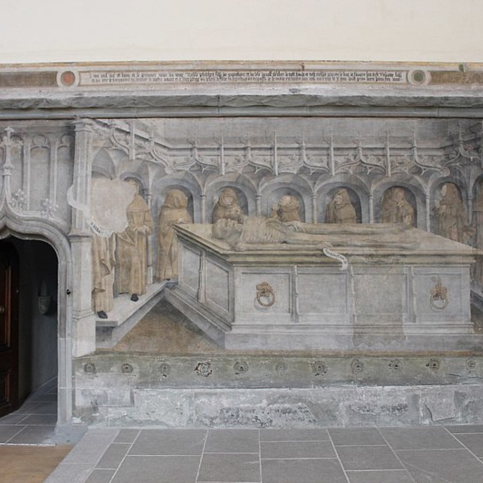 Raro e di particolare rilievo è anche il grande dipinto murale (h 2,20x5 metri) che orna la parete sinistra del coro, frammento di una più ampia composizione e fino ad allora nascosto dietro gli stalli lignei. Simboleggia la sepoltura di Philibert de Monthouz, consigliere dei Duchi di Savoia e di Borgogna, morto nel 1458. Domina la composizione un grande sarcofago lapideo su cui è raffigurato lo scheletro del defunto. Tutt’intorno, all’interno di nicchie architettoniche con volte a crociera, è il corteo di piangenti vestiti del saio. L’affresco, realizzato a grisaille, cioè a monocromo nei toni del grigio, è attribuito ad Hans Witz, originario di Eichstätt in Baviera, attivo dalla metà del Quattrocento per l’alta committenza dei Savoia tra Chambéry e Ginevra e punto di riferimento essenziale per gli scambi tra l’Italia e il Nord Europa.