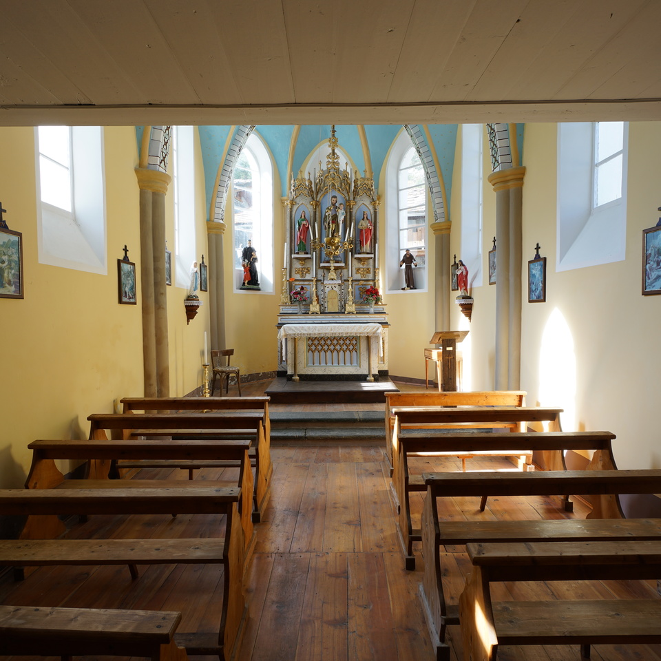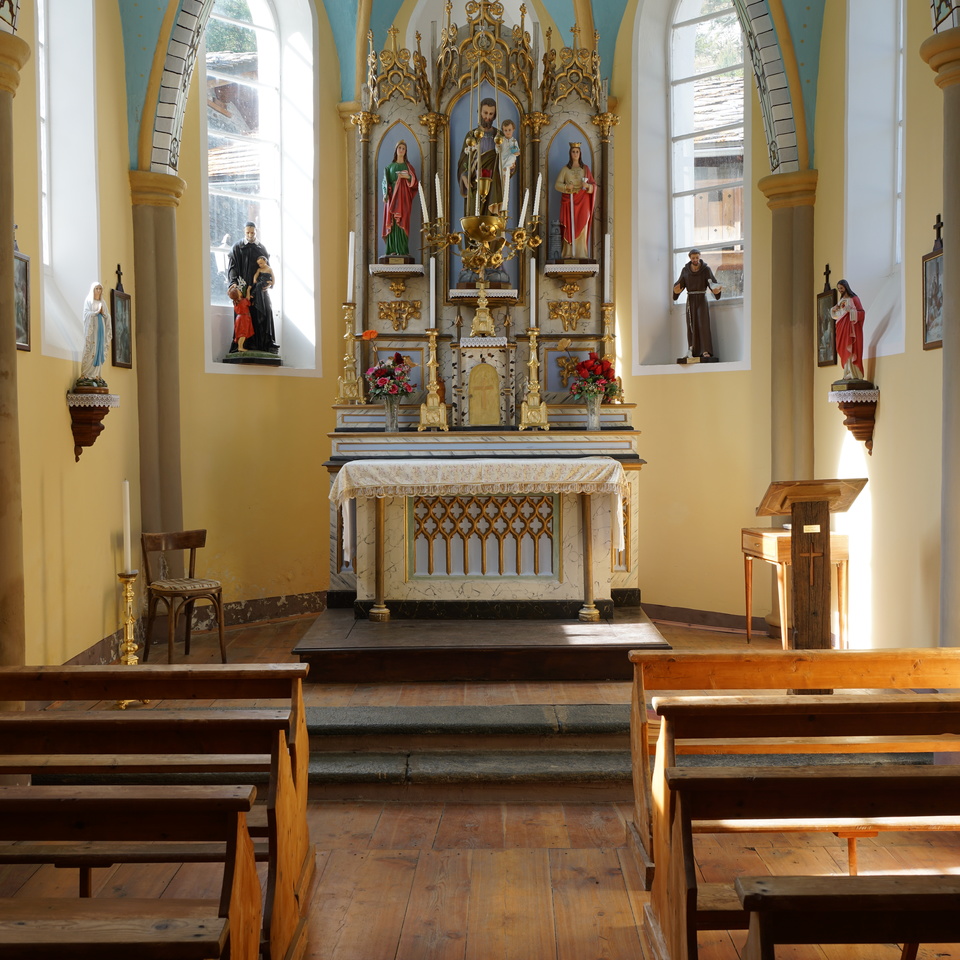 Dedicata ai santi Giuseppe, Ilario e Barbara, la cappella è stata costruita in stile neogotico dall’impresario e architetto Giuseppe Lancia negli anni 1890-1891 in sostituzione di una cappella più antica, fondata nel 1648 da Germain di Claude Usel di Mondanges. Di quest’antica cappella si conservava un dipinto datato 1649, raffigurante il Padre Eterno con la Colomba dello Spirito Santo e la Sacra Famiglia, purtroppo rubato nel 1982. Ampliata e ristrutturata nel 1744, la cappella risultava in pessime condizioni già a metà del XIX secolo tanto che un veterano delle armate napoleoniche, Sulpice Joseph Frassy, decise nel 1862 di destinare 100 lire per ripararla. La cifra non era però sufficiente per cui il parroco di Valgrisenche aprì una sottoscrizione in tutta la parrocchia. Negli anni successivi riuscì a raccogliere la somma di 3522 lire con la quale poté procedere alla ricostruzione dell’edificio, benedetto il 13 settembre 1891 dal vescovo di Aosta Mons. Joseph-Auguste Duc.