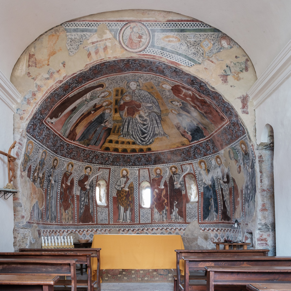 Nel 1432, il committente Domenico Pago, chirurgo di origine marchigiana, si trasferisce qui dove conduce una vita eremitica. Il suo impegno per la cura della chiesa di Santa Maria, allora diroccata, si esprime anche nella volontà di abbellire le superfici interne, la cui realizzazione è affidata ad un frescante di cui non si conosce il nome, denominato dagli studi “Maestro del chirurgo Domenico della Marca d’Ancona”. Il pittore, qui impegnato nel 1440, affresca completamente le pareti dell’abside con la Teoria degli Apostoli e la calotta dove spicca una raffinata Madonna in trono affiancata da santi e sante, e dal committente in ginocchio.