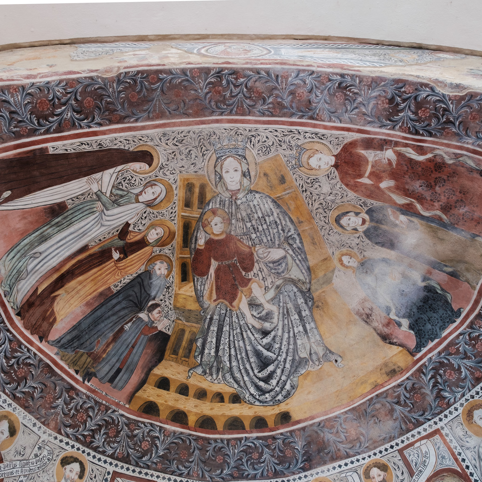 Al centro del catino absidale è dipinta la Madonna in trono col Bambino. Maria, dedicataria della chiesa, siede regale e porta sul capo una corona con gemme incastonate. Indossa un sontuoso manto bianco che cade sui gradini del trono facendo molte pieghe, decorato con motivi floreali realizzati con la tecnica delle mascherine, simile agli stencils. In braccio a lei, Gesù Bambino che con la mano destra benedice, mentre con la sinistra sorregge il globo terrestre, simbolo del potere divino sulla terra.