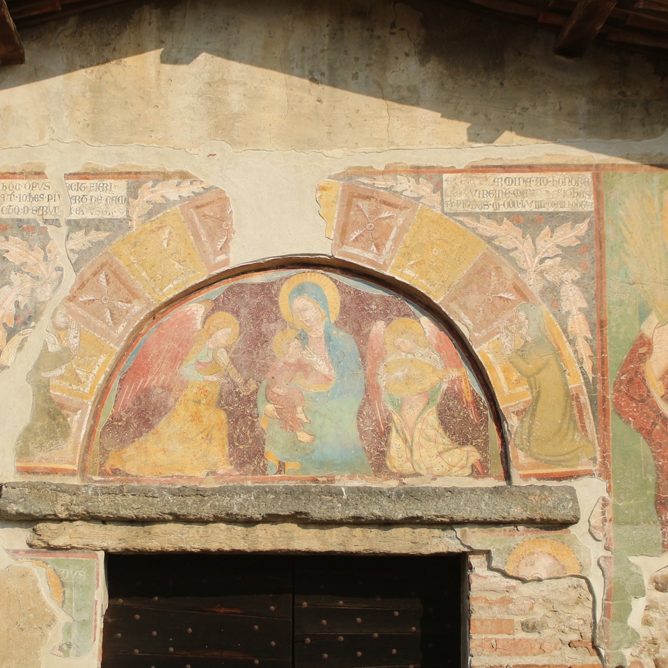 L’affresco sulla facciata, che raffigura i coniugi Pivart, testimonia una lunga frequentazione delle antiche vie che – partendo dalla Val di Susa – scendevano sino a Piobes, importante avamposto sottoposto all’autorità vescovile di Torino. Probabilmente i due commercianti-pellegrini, scesi dai passi alpini, furono colti da una tempesta di neve e, dopo essersi salvati, fecero dipingere l’affresco in onore dei santi che li avevano protetti. Nel grande dipinto, in più riquadri, sono raffigurati: san Giovanni Battista, con l’Agnello simbolo del Cristo martire; san Bernardo di Mentone, protettore dei viandanti che si perdevano sulle Alpi, raffigurato con una catena che tiene legato il Demonio (affresco parzialmente conservato); san Cristoforo col Bambino Gesù sulle spalle, protettore dei viaggiatori; Madonna che allatta Gesù tra due angeli musicanti: qui il Messia tiene nelle mani un cardellino, simbolo della morte sulla croce. Secondo la tradizione medioevale, il cardellino e l’usignolo tentarono di togliere le spine della corona dolorosa posta sul capo di Cristo crocifisso ma si punsero e colorarono per sempre una parte delle loro piume di rosso. La Madonna che allatta rappresenta invece la Madre Chiesa che nutre i fedeli; il latte può essere paragonato al battesimo, linfa che introduce il battezzato nella vita comunitaria, mentre il cardellino rappresenterebbe la speranza della resurrezione dopo la morte, come avvenne a Gesù.