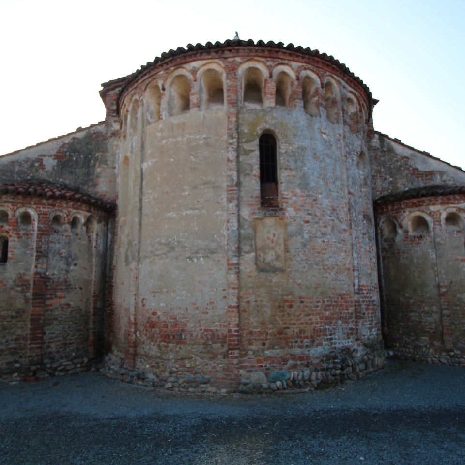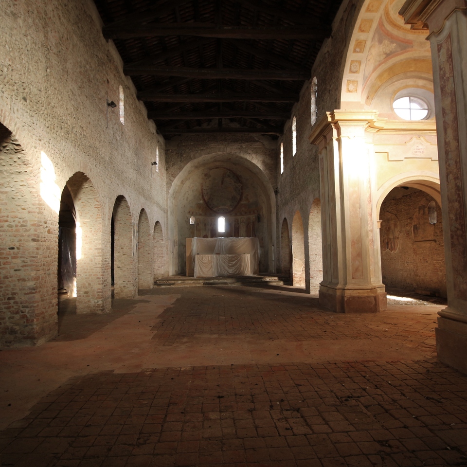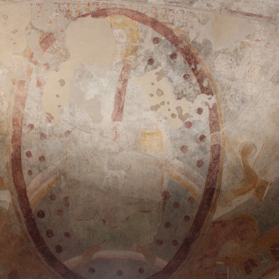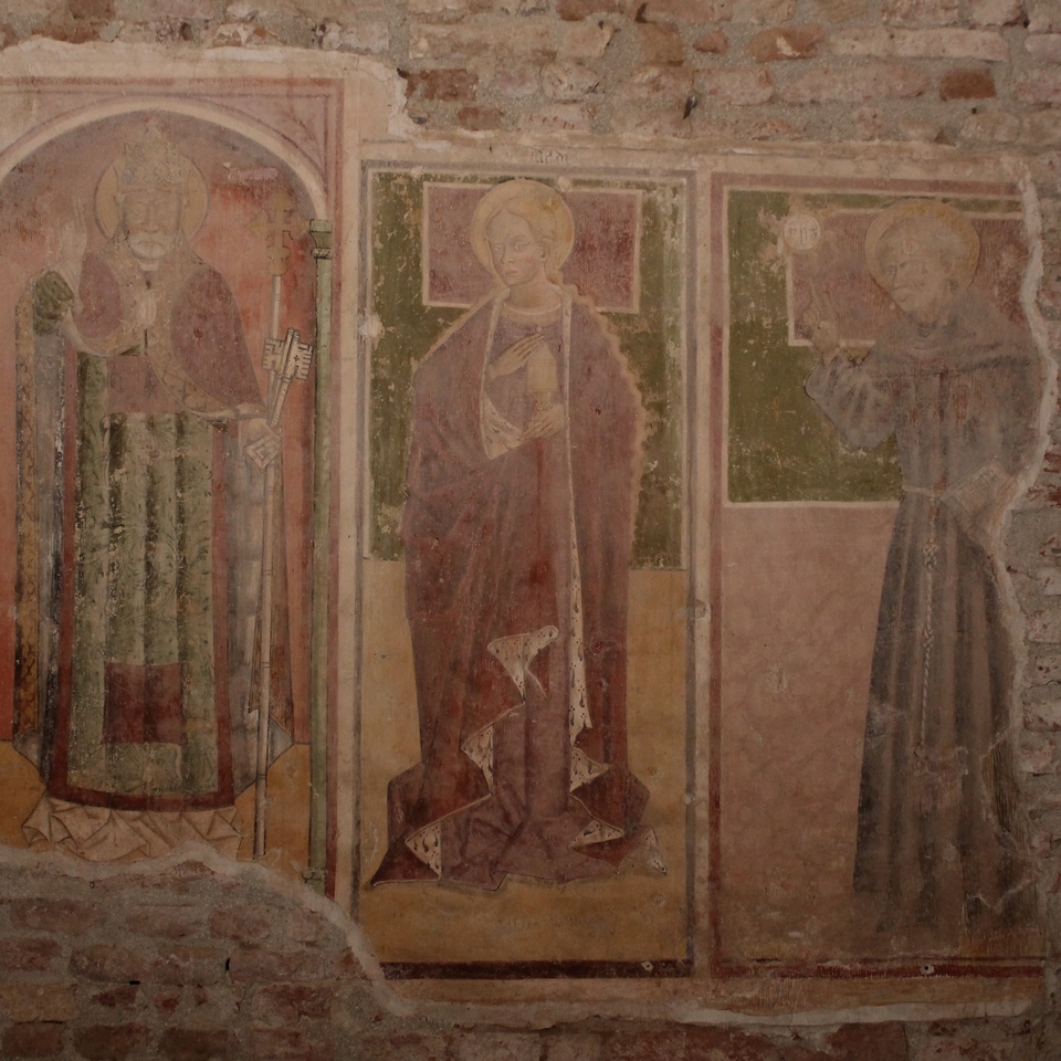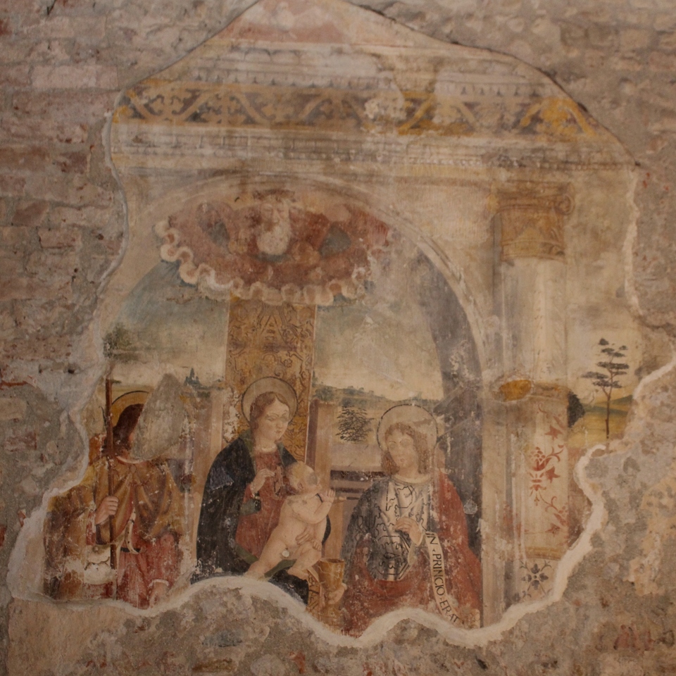 Nella sacrestia, collocata nell’absidiola destra, sono conservate grottesche cinquecentesche, resti di immagini marine, un san Pietro in cattedra, una Annunciazione commissionata dalla nobile famiglia Aliberti di cui compare lo stemma, e una rara raffigurazione della “Trinità” cosiddetta “orizzontale”, con le tre figure identiche e colte nell’atto di impartire la benedizione. Dietro l’altare maggiore, il catino absidale è decorato da un Cristo in Maestà all’interno di una mandorla porpora, che regge il Libro dell’Apocalisse, ormai chiuso, e l’Agnello del sacrificio. In basso, figure di Apostoli e della Vergine Maria. Questo grande affresco, completato dai simboli degli Evangelisti e dalla Deesis (“Supplica”) con la Madonna e Giovanni Battista, può essere datato all’880-890, in piena epoca ottoniana, quando il matrimonio tra l’imperatore Ottone II e la bizantina Teofano creò una importante commistione tra la pittura tedesca e orientale.