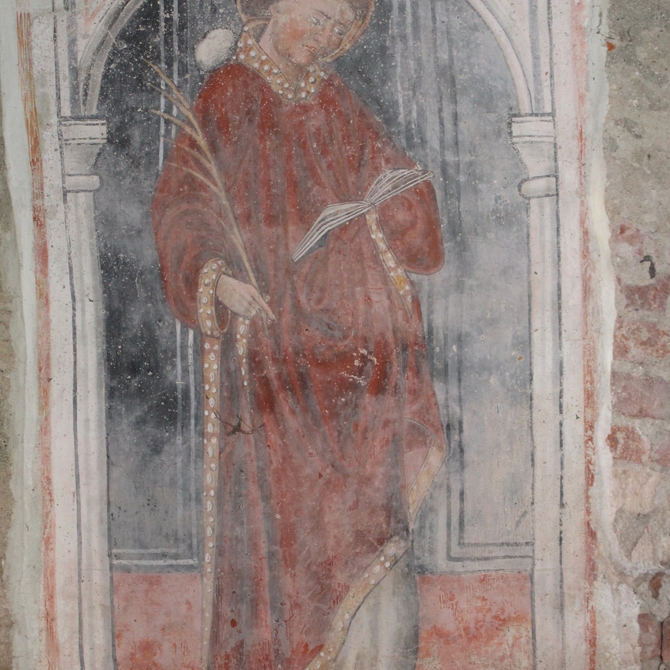 Nella navata sinistra un affresco devozionale, databile tra le fine del Cinquecento ed i primi dei Seicento, raffigura santi legati alla protezione dalle malattie infettive, come Rocco, Sebastiano, Agostino, Giovanni Battista, Grato e Antonio Abate. Nella stessa navata erano inoltre presenti un ciclo di affreschi realizzati ad inizio Quattrocento da Giovanni Beltrami di Pinerolo su committenza della famiglia Novelli: staccati dalla Soprintendenza e in deposito presso la Galleria Sabauda di Torino, oggi li possiamo ammirare in una riproduzione fotografica.