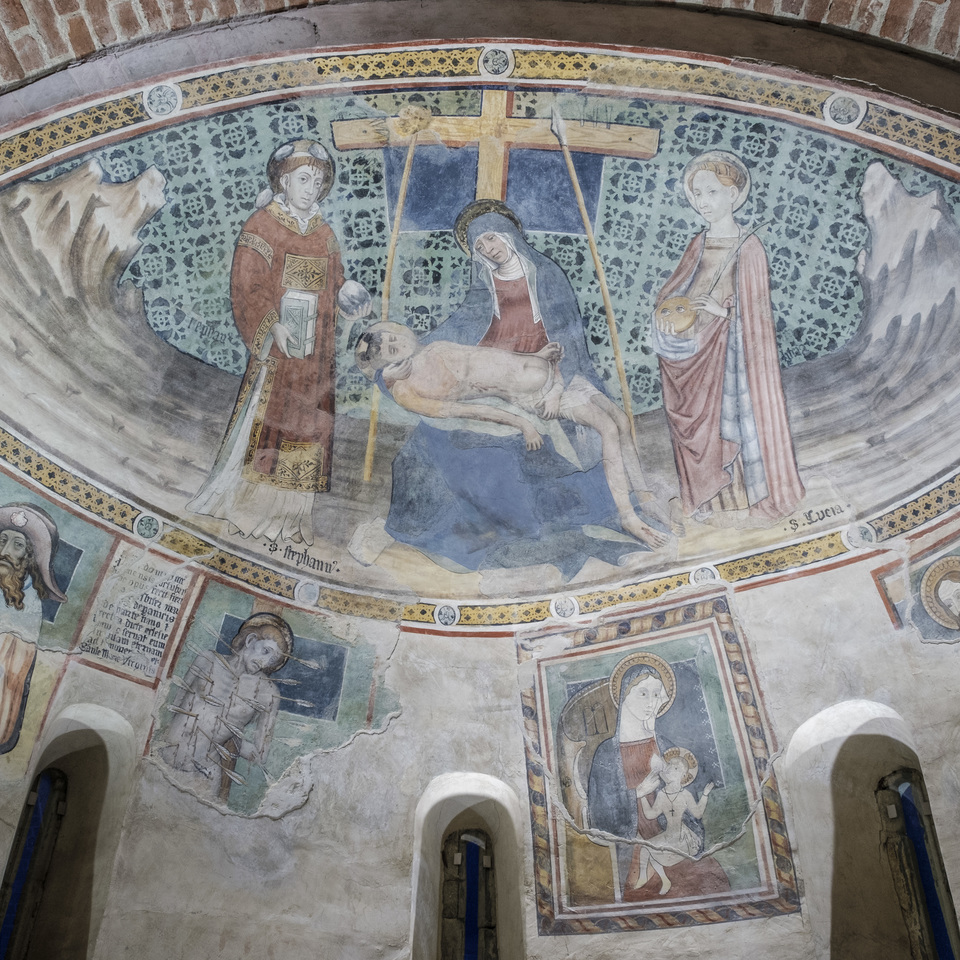 Nel catino è invece dipinto un Compianto sul Cristo Morto con la Madonna che sorregge il figlio, affiancata da santa Lucia e da santo Stefano. Lo sfondo riporta elementi decorativi realizzati con degli stampini con diverse tonalità di verde.