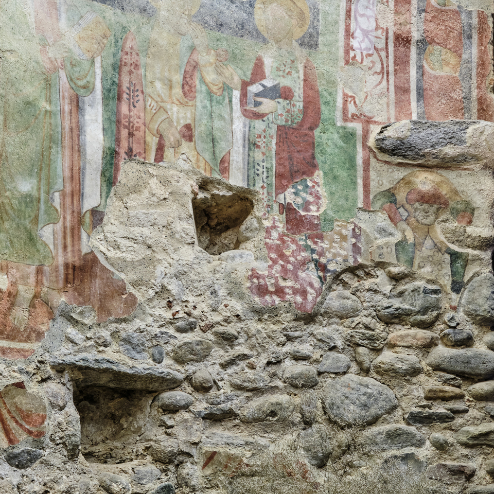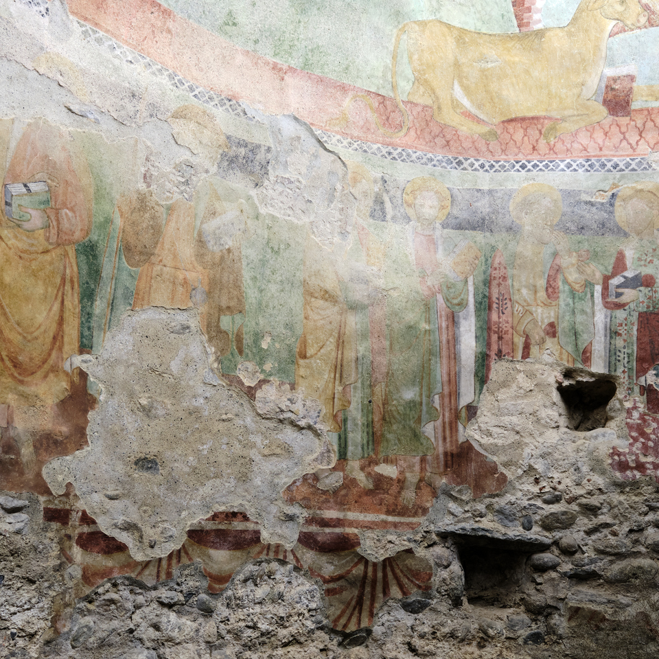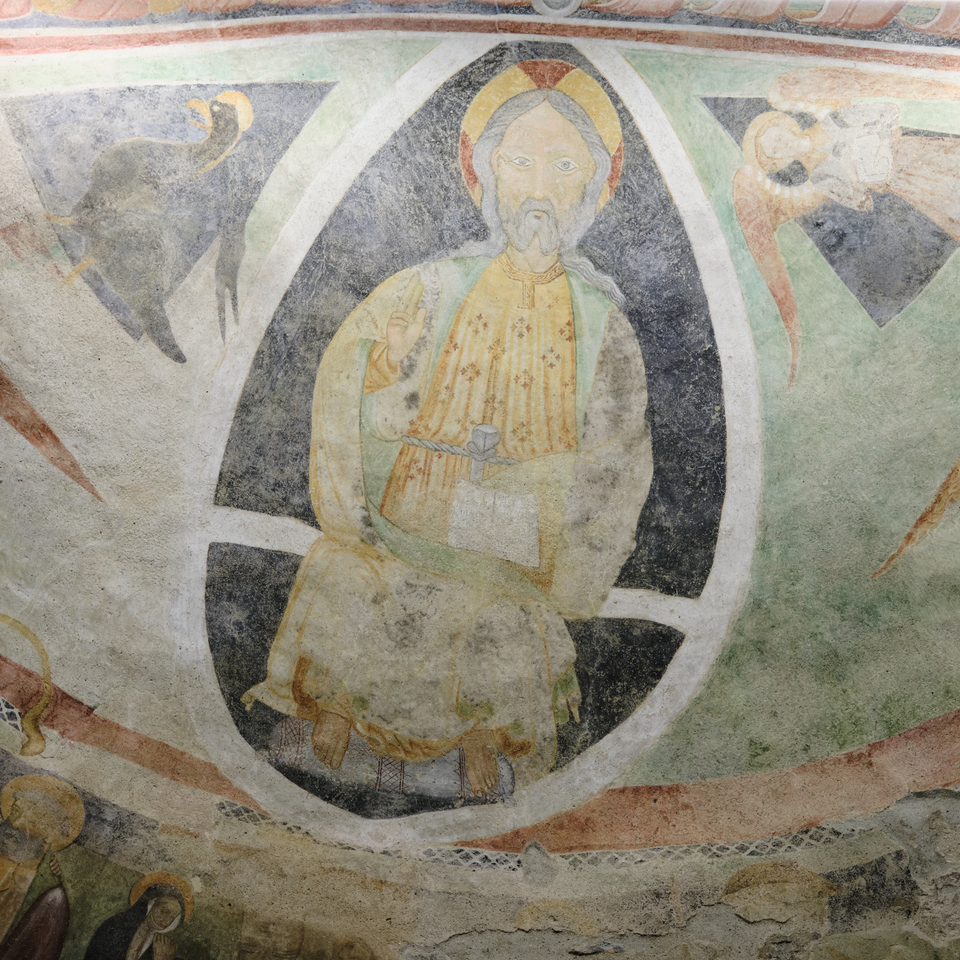 Il catino absidale è occupato nella parte della calotta dal Cristo in mandorla affiancato dal Tetramorfo. Nella fascia mediana è affrescata al Teoria degli Apostoli. Ai lati sono presenti due telamoni dipinti, i cui corpi provati dalla fatica servono a ricordare la disarmonia dell’umanità rispetto alla perfezione del divino.