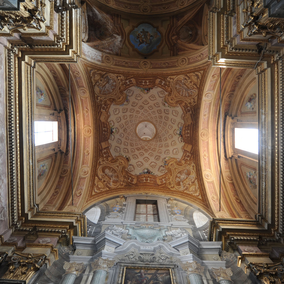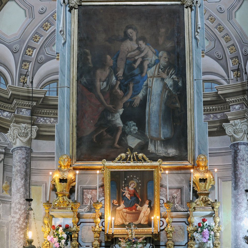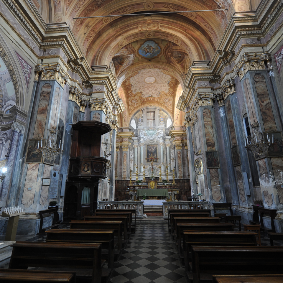 Al centro, spiccano l’altare maggiore, opera di Bernardo Antonio Vittone, datato 1736 e realizzato in marmi policromi, e la balaustra con gli stemmi del committente Giuseppe Aubert (1762).