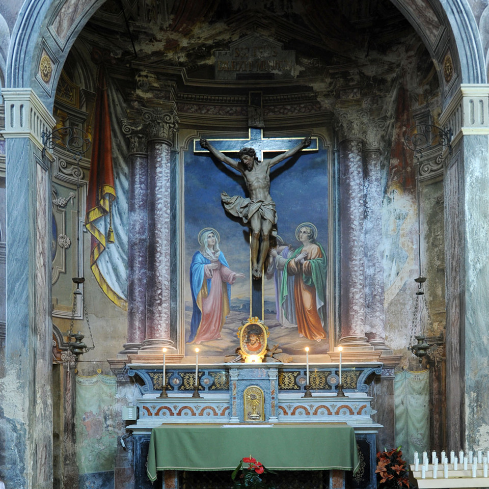 Anche le testimonianze artistico-devozionali conservate a Caramagna riflettono chiaramente la centralità di questo culto e l’impegno profuso dai confratelli nel corso dei secoli con committenze di alto livello: a Carlo Giuseppe Plura si deve la realizzazione del mirabile crocifisso ligneo (1721) che orna l’omonima cappella destra di recente restauro e ad un abile argentiere la stauroteca settecentesca che conserva una reliquia in legno che, secondo la tradizione, conserva un frammento della Santa Croce di Gesù.
