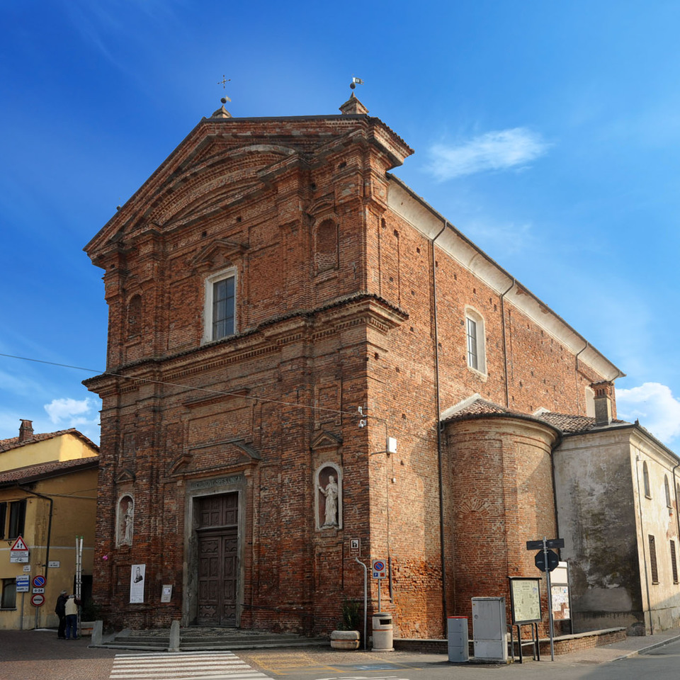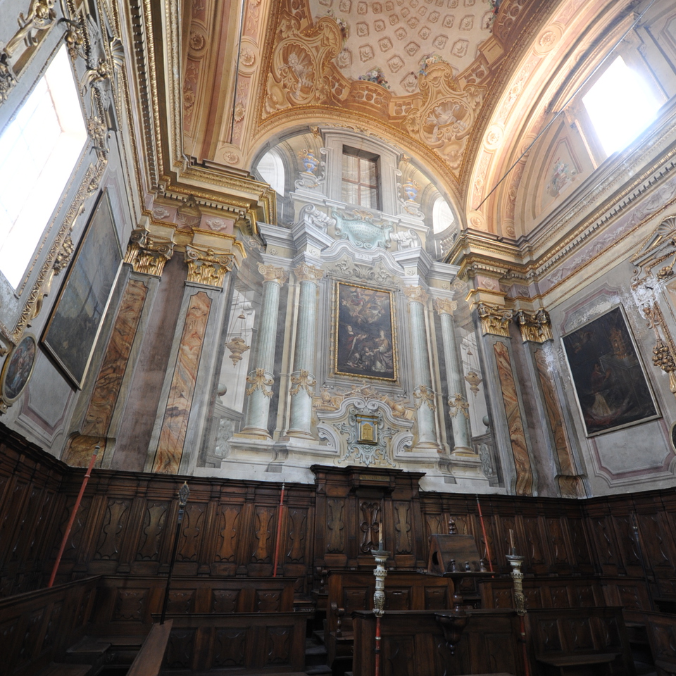 L’avvio del cantiere di Santa Croce si riconduce al 1668 quando, per volontà della Compagnia dei Disciplinanti, poi aggregata a quella del Santissimo Crocifisso, si decise di erigere una nuova chiesa in sostituzione del piccolo oratorio di Santa Croce. Affianco a “Porta Nuova”, una delle quattro vie d’accesso alla città e sul sito degli antichi bastioni, l’architetto Francesco Lanfranchi edifica un’imponente architettura barocca, realizzata su munificenza di diversi benefattori e della Municipalità. I lavori procedono rapidamente, poiché già nel 1673 Carlo Gallo può decorare nicchie e finestre, nel 1706 il campanile risulta completato, e nel 1714 si dà principio alla realizzazione degli stalli del coro.