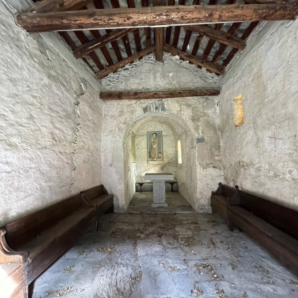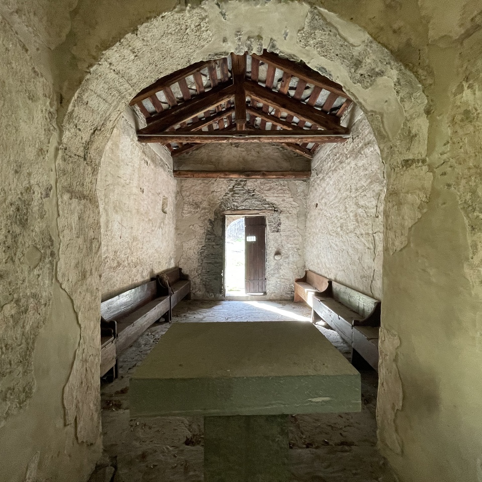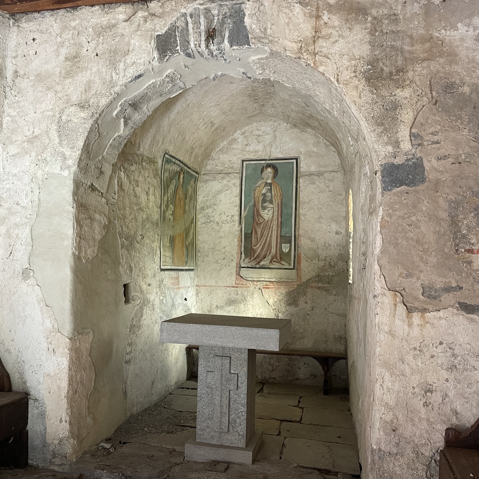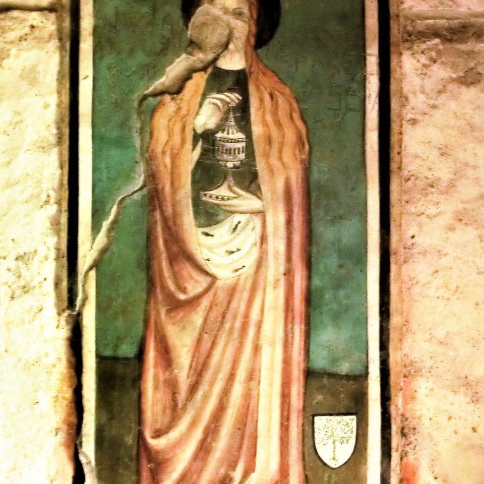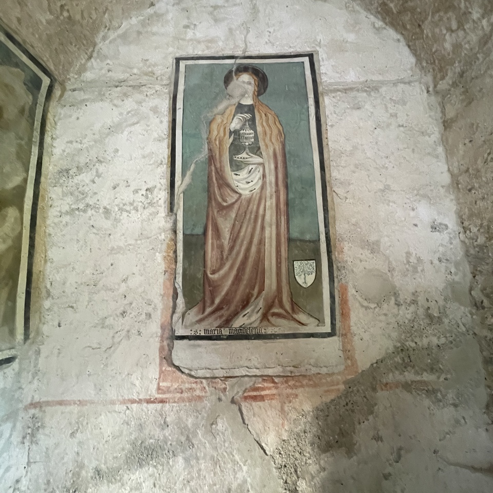 Nell’abside il riquadro affrescato del sec XV sulla parete ospita la figura di Maria Maddalena. La figura è rivolta verso di noi, avvolta da un lungo manto rossiccio che cade al suolo e si apre solo in prossimità del petto lasciando scoprire un risvolto in armellino, ossia in pelliccia bianca macchiettata di nero con la punta della coda dell’ermellino. Il suo volto è giovane e fresco. I lunghi capelli ramati cadono lungo le spalle, fino ai gomiti: sono i capelli con cui asciugò i piedi di Cristo bagnati dalle sue lacrime