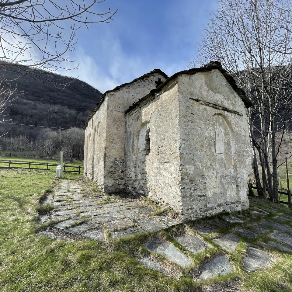 La cappella di Santa Maria rispecchia nelle sue linee generali la costruzione originaria, risalente ai primi periodi di vita del monastero, come suggeriscono anche le tracce di decorazione pittorica dell’VIII secolo ancora leggibili, in particolare all’interno, sulla parete di controfacciata. A questa prima fase fanno seguito due importanti rifacimenti costruttivi: uno connesso al ritorno dei monaci, sul finire del X secolo (in tale occasione non furono mutate le caratteristiche planimetriche ma si sostituirono gli arconi ciechi esterni con coppie di archetti); il secondo, nell’XI secolo inoltrato, quando venne ricostruito il lato settentrionale della navata, crollato per cause naturali. Il Chronicon Novalicense così parla di questa cappella (II, 2): «dinanzi al sacro cenobio, e lontana da esso un tiro di freccia, v’era una chiesa, eretta in onore della beatissima e gloriosissima vergine Maria, presso la quale si prende la via che conduce al monastero. Nelle vicinanze della chiesa v’era una casa in cui venivano ospitate le donne, nobili che fossero o di umile origine, quando giungevano al santuario per adorare Dio e onorare gli Apostoli». Infatti nell’antichità la cappella di Santa Maria segnava l’ingresso del monastero altomedievale, ne proteggeva simbolicamente l’accesso, e in questo luogo i visitatori sostavano per un breve momento di preghiera (un esempio analogo si trova nel monastero di Saint-Riquier, in Gallia). La funzione di collegamento con il mondo esterno svolta dalla cappella di Santa Maria è sottolineata non solo dal passo del Chronicon ma anche dal fatto che tutte le tombe scavate intorno ad essa appartengono a bambini e neonati. Le ricerche archeologiche hanno messo in luce, sia all’interno che all’esterno della cappella, lacerti murari di epoche diverse: alcuni riconducibili ad una struttura precedente rispetto a quella altomedievale, ma troppo frammentari per consentire di ricostruirne la pianta; altri interpretabili, verosimilmente, come tratti del recinto che delimitava il monastero su questo lato.