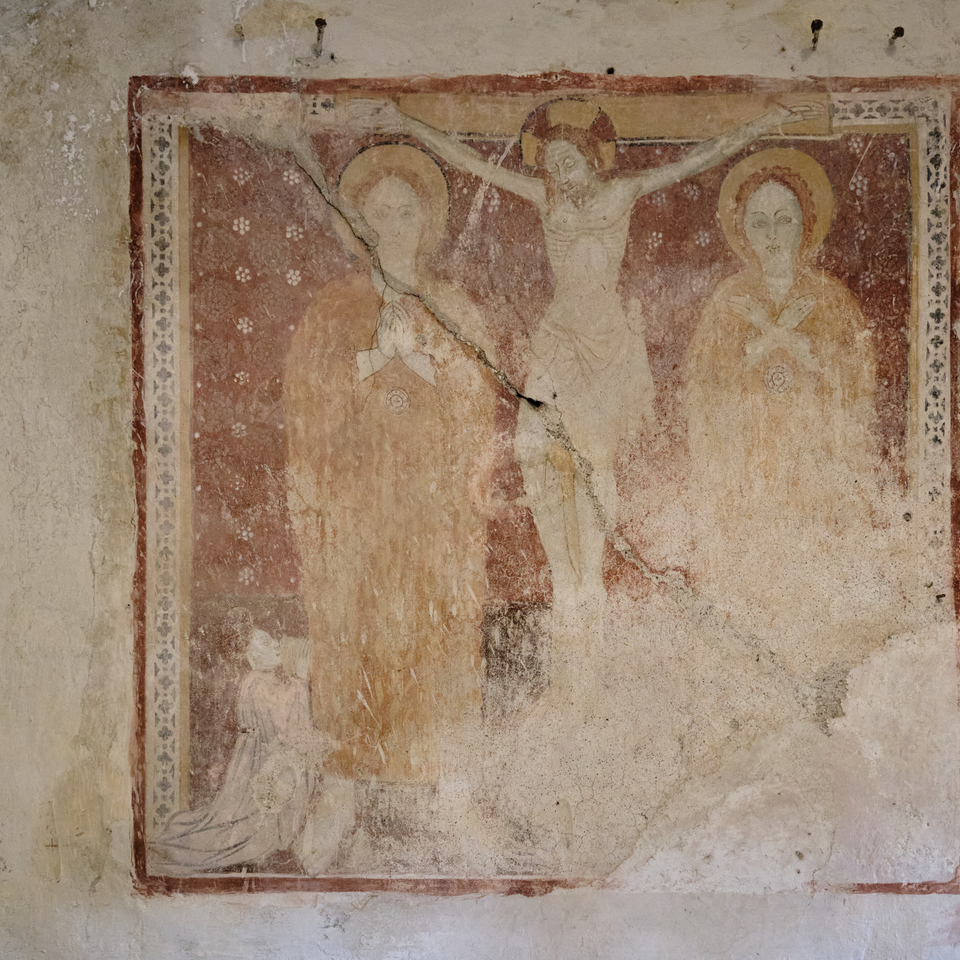 La sacrestia conserva l’unico affresco antico ad oggi superstite raffigurante il Cristo in croce affiancato dalle sante Maria Maddalena e Maria Egiziaca. L’intervento è attribuito ad un artista della cerchia del Maestro del chirurgo Domenico della Marca d’Ancona, qui attivo tra il 1425 e il 1430.