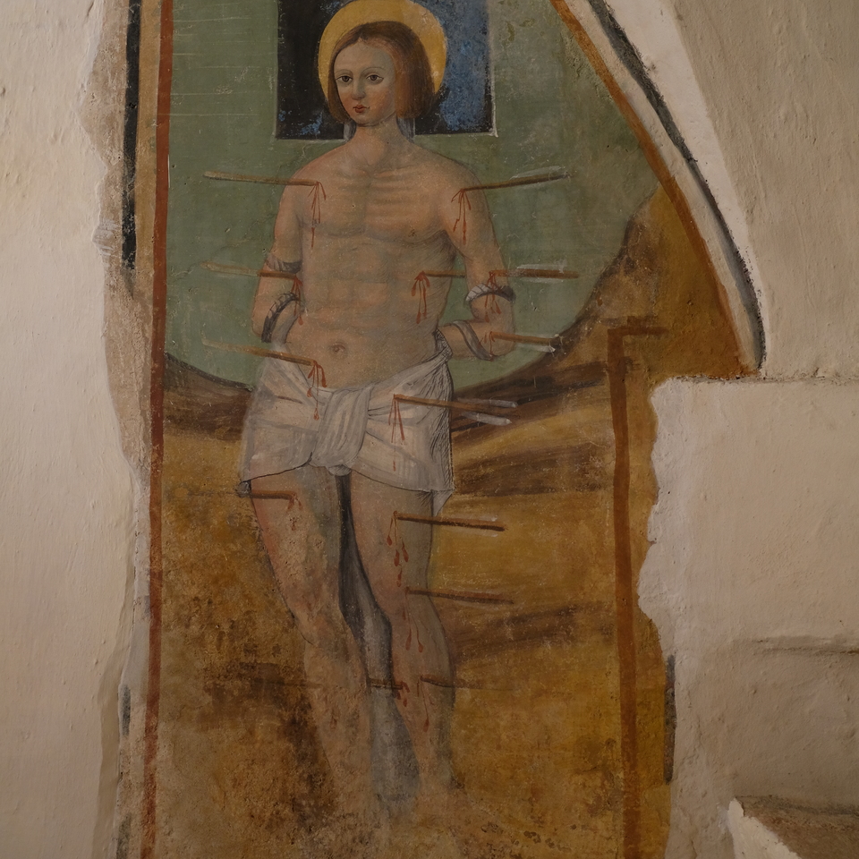 Nell’interno sono conservate preziose pitture murali di notevole interesse artistico, risalenti al XV e
