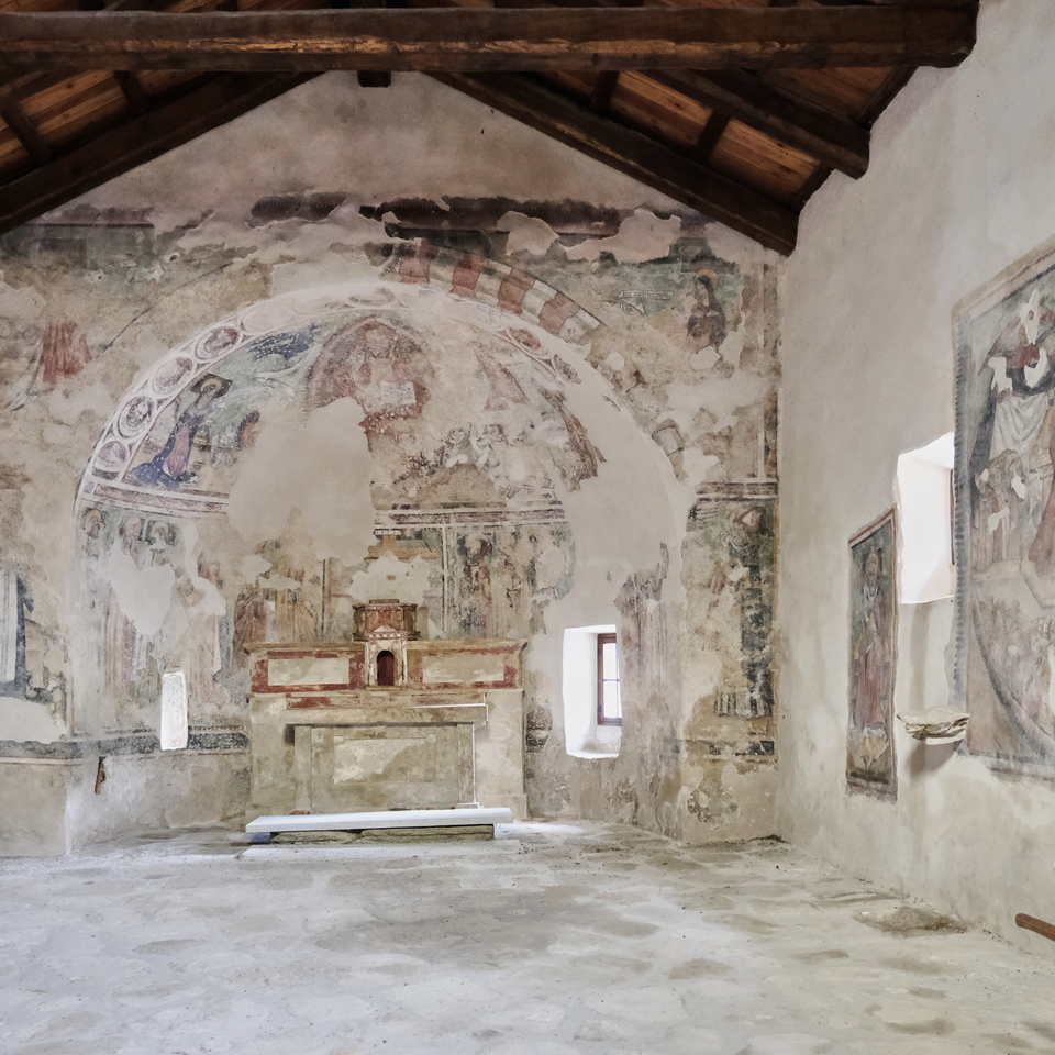 La superficie muraria dell’abside esterno è poligonale ed è decorata con archetti pensili di gusto romanico. L’interno presenta invece un’aula rettangolare, con soffitto in legno a capriate e affreschi, oggi visibili grazie ad un importante intervento di restauro avvenuto nel 2008.m