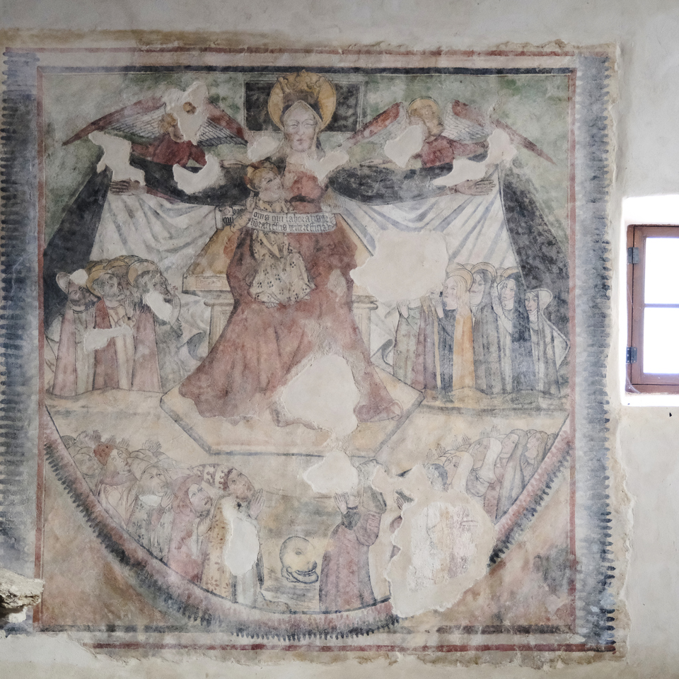 La giovane donna ha sul capo una corona e le braccia aperte in un abbraccio universale. Il mantello è sollevato da due angeli con ali colorate e boccoli dorati sotto il mantello figure inginocchiate e con le mani giunte in atto di preghiera. Figure femminili sulla destra e maschili, sulla sinistra. La schiera superiore ospita santi (forse apostoli) a sinistra e sante a destra. Quella inferiore rappresenta la gerarchia terrena: papa, cardinale, signori, religiosi e religiose. Al centro, un teschio. Un simbolo che ricorda ai viventi il limite dell’esistenza umana.