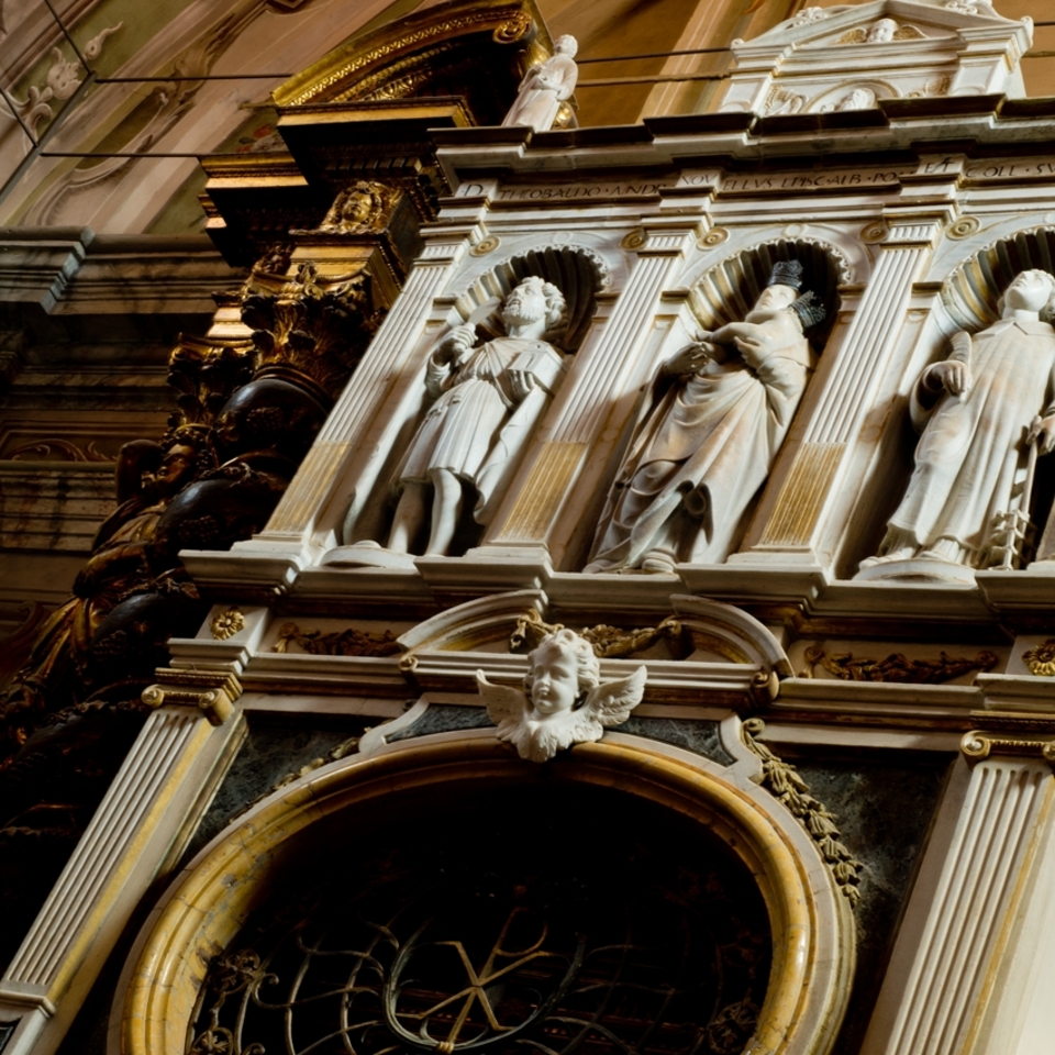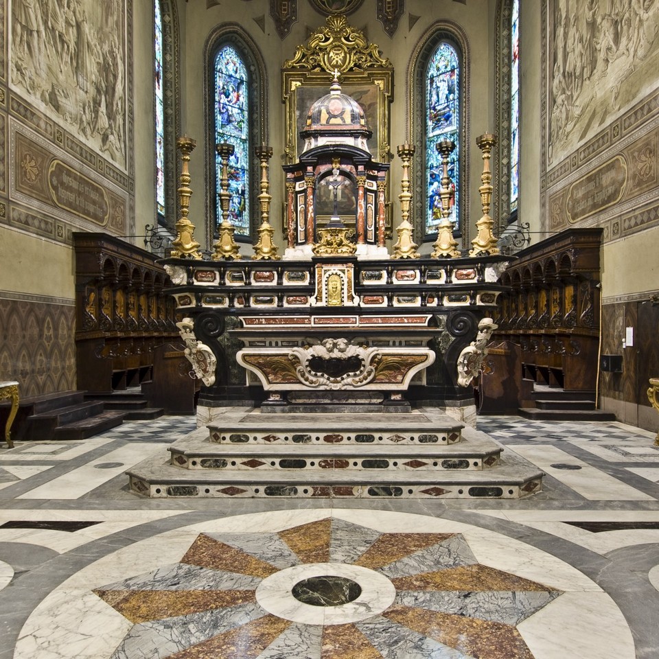 I preziosi intarsi dei trentacinque stalli di cui è composto illustrano nature morte e paesaggi d’invenzione di elevata abilità tecnica. È il luogo del canto della liturgia delle ore, qui i presbiteri canonici elevavano gli inni e i salmi della lode e del ringraziamento.