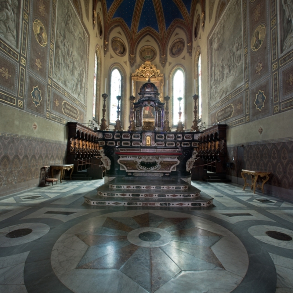 Lungo la parete absidale si colloca il prezioso coro ligneo di Bernardino Fossati da Codogno (1512).