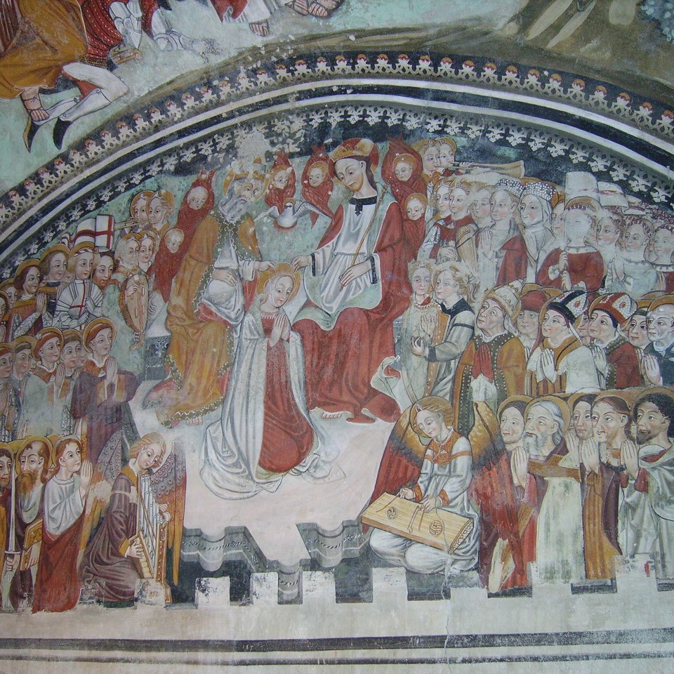 Sulla parete destra: la Città Celeste con la schiera dei beati, degli angeli musicanti e dei santi che in modo ordinato assistono all’incoronazione di Maria, inginocchiata al centro di un largo trono, vestita di rosso, con un gran mantello bianco. Fuori delle mura turrite, le Opere di Misericordia.