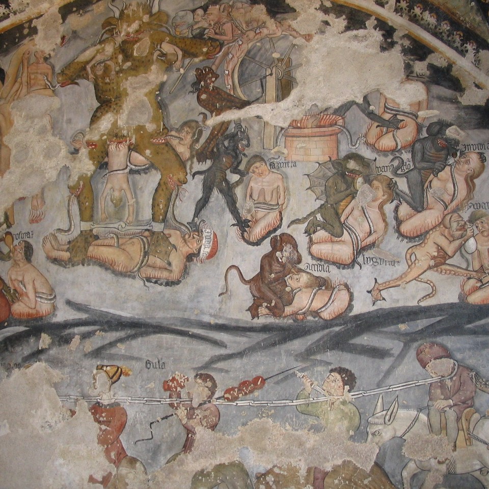 Sulla parete sinistra: l’Inferno dove l’imponente figura di Lucifero campeggia al centro, mentre inchioda Giuda con gli unghioni; al di sotto corre la Cavalcata dei Vizi, che raffigura i sette peccati capitali, e precipita nella Bocca spalancata del Leviatano.